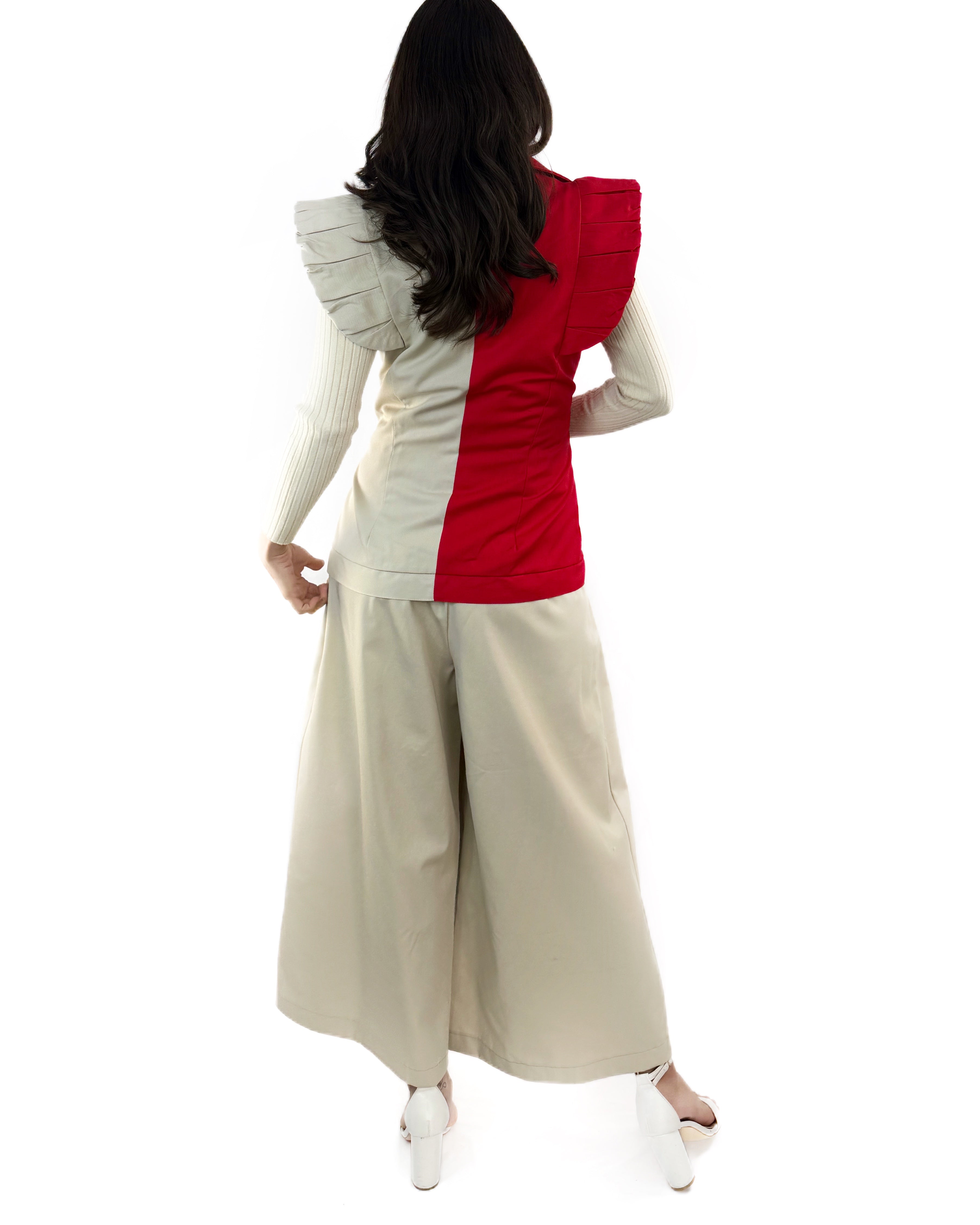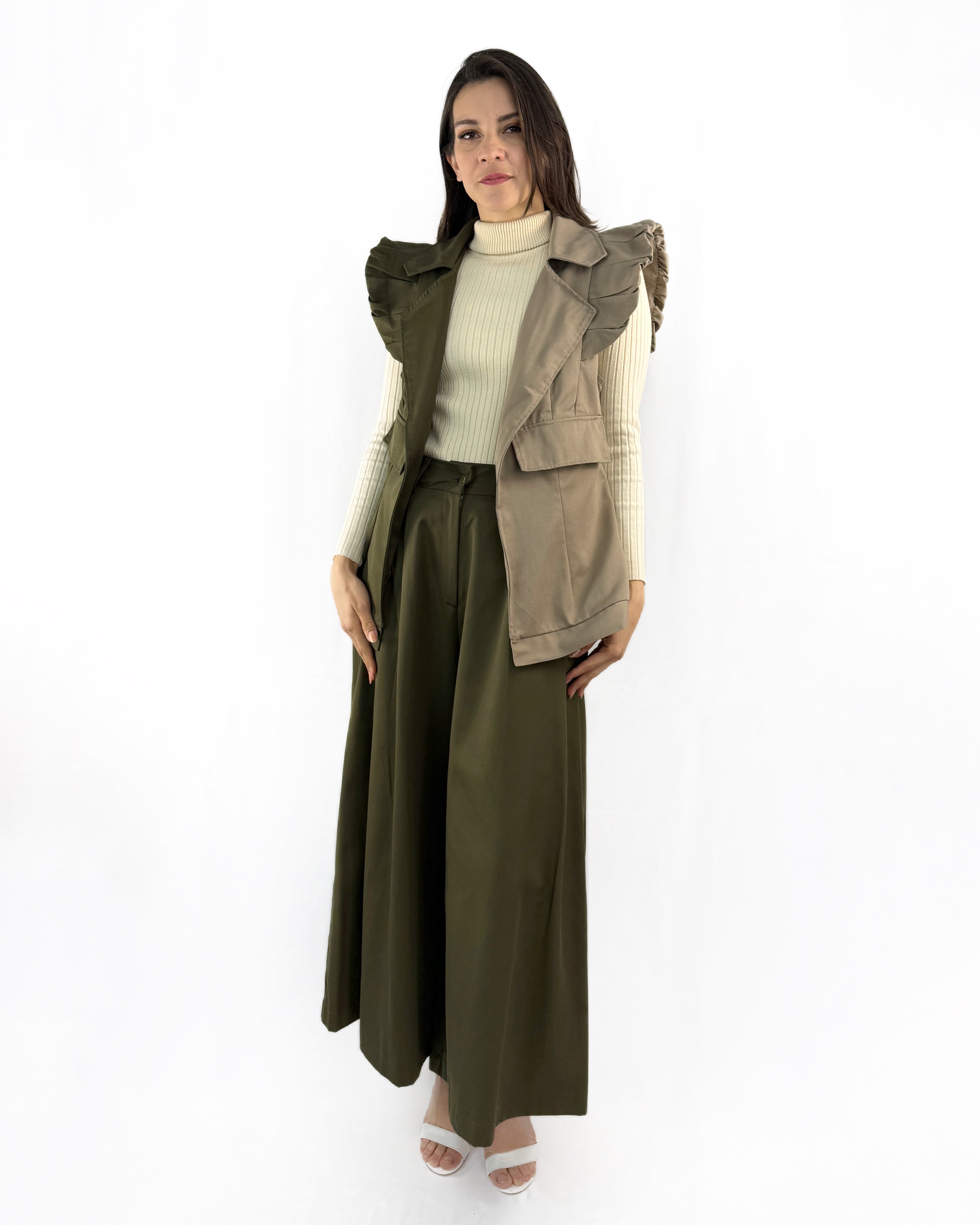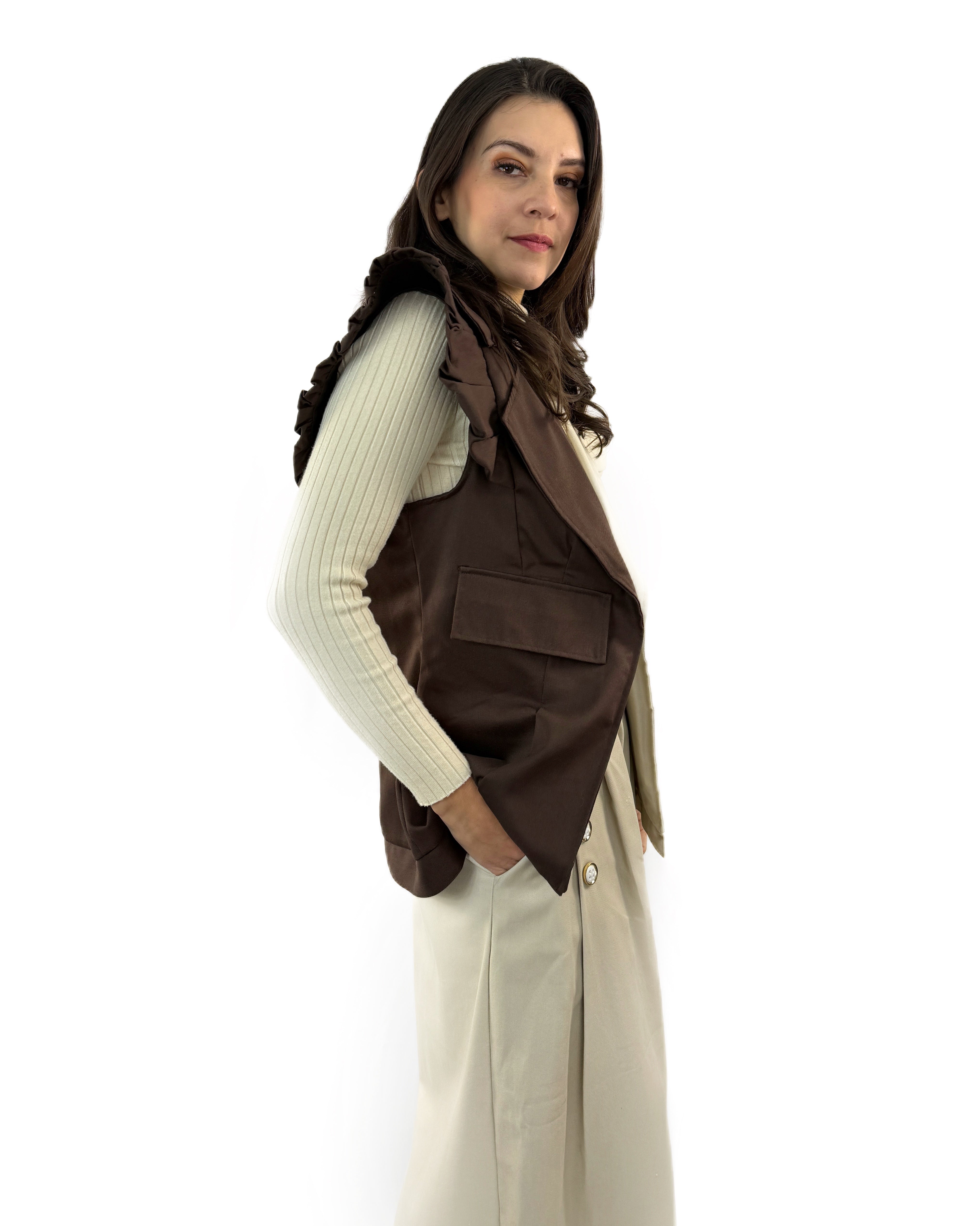 Chaleco (UNITALLA) confeccionado en gabardina 100% algodón, diseñado para realzar la silueta con un ajuste que moldea delicadamente la cintura. Su diseño estructurado se complementa con olanes fluidos que aportan movimiento, carácter y un toque sofisticado a la prenda.