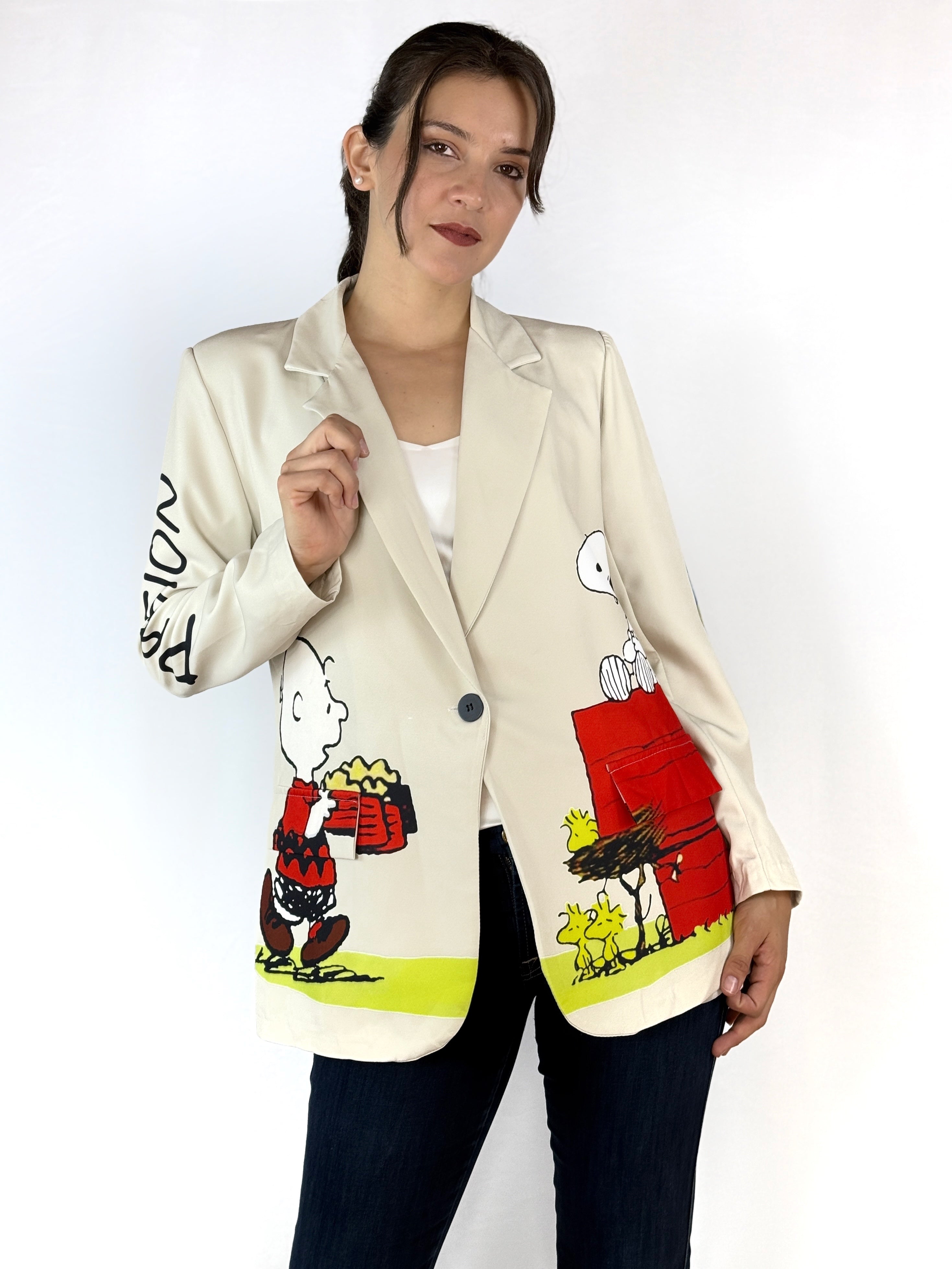Es un blazer color hueso con ilustraciones vibrantes de Snoopy y sus amigos, ideal para quienes no temen expresarse con autenticidad. Su corte clásico se combina con un diseño inesperado, convirtiéndolo en la prenda statement perfecta para looks casuales con actitud.