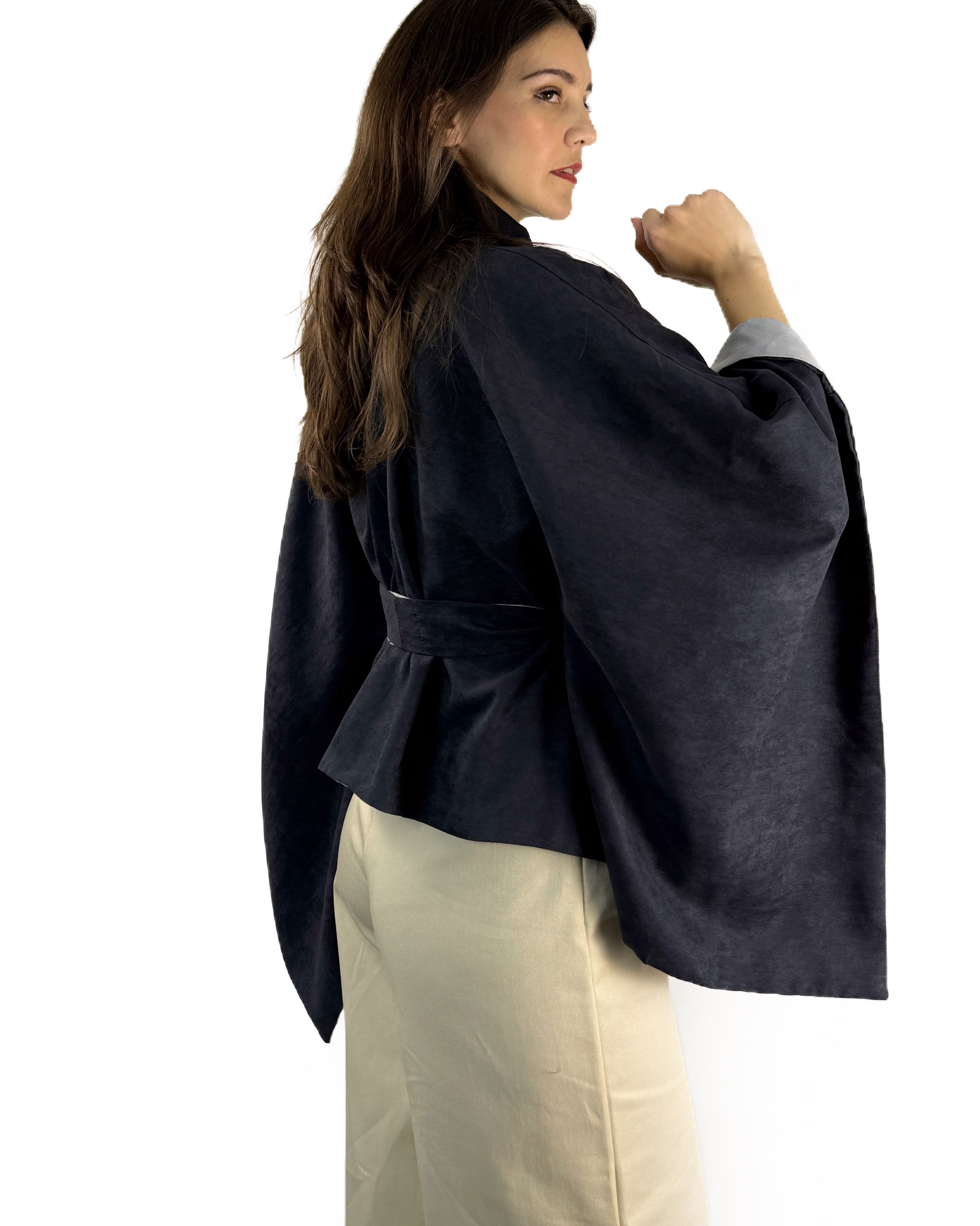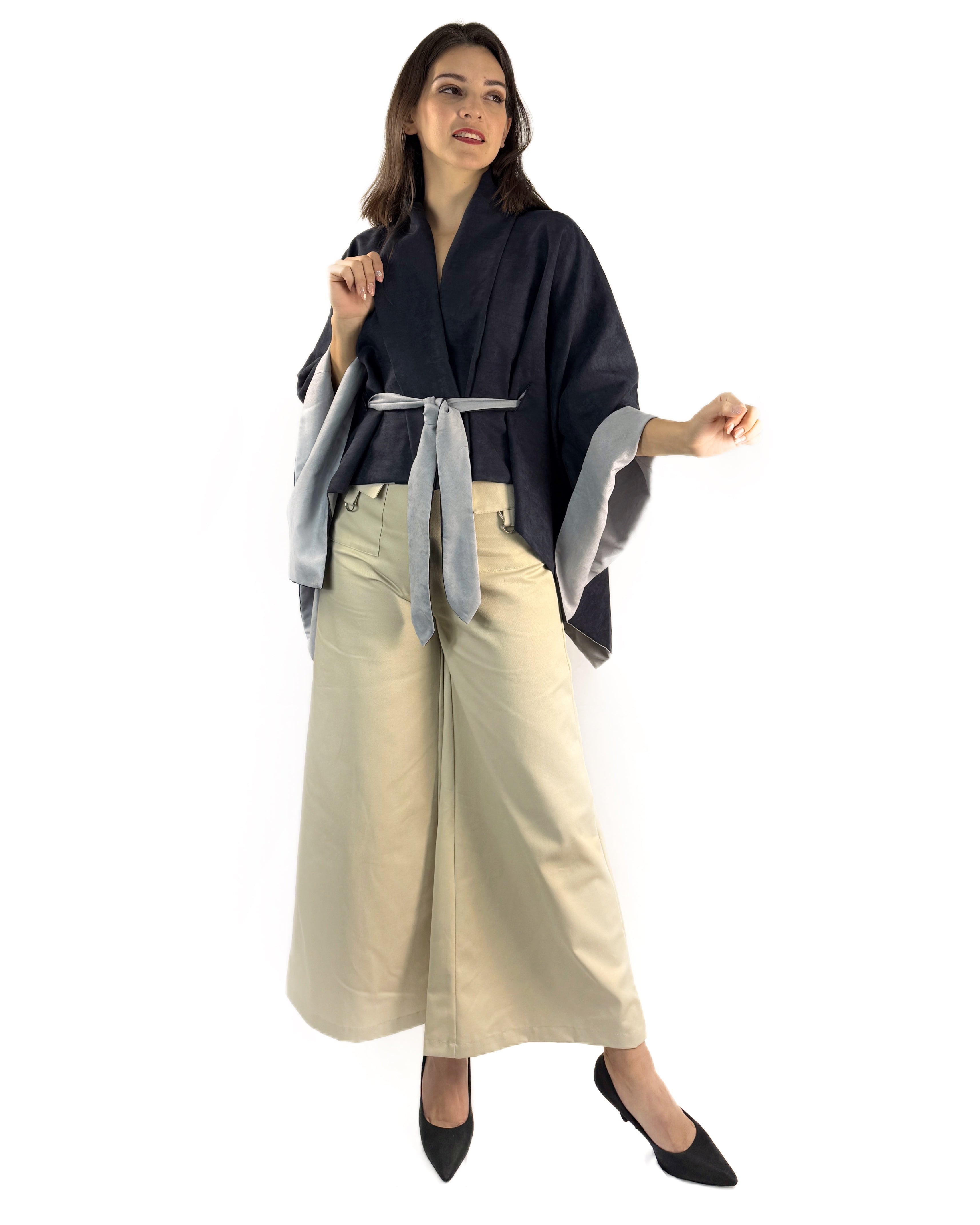 Capa UNITALLA confeccionada en tela suede de tacto suave, diseñada para brindar comodidad, movimiento y versatilidad. Su diseño doble vista permite llevarla de distintas formas, adaptándose a diferentes estilos y ocasiones.