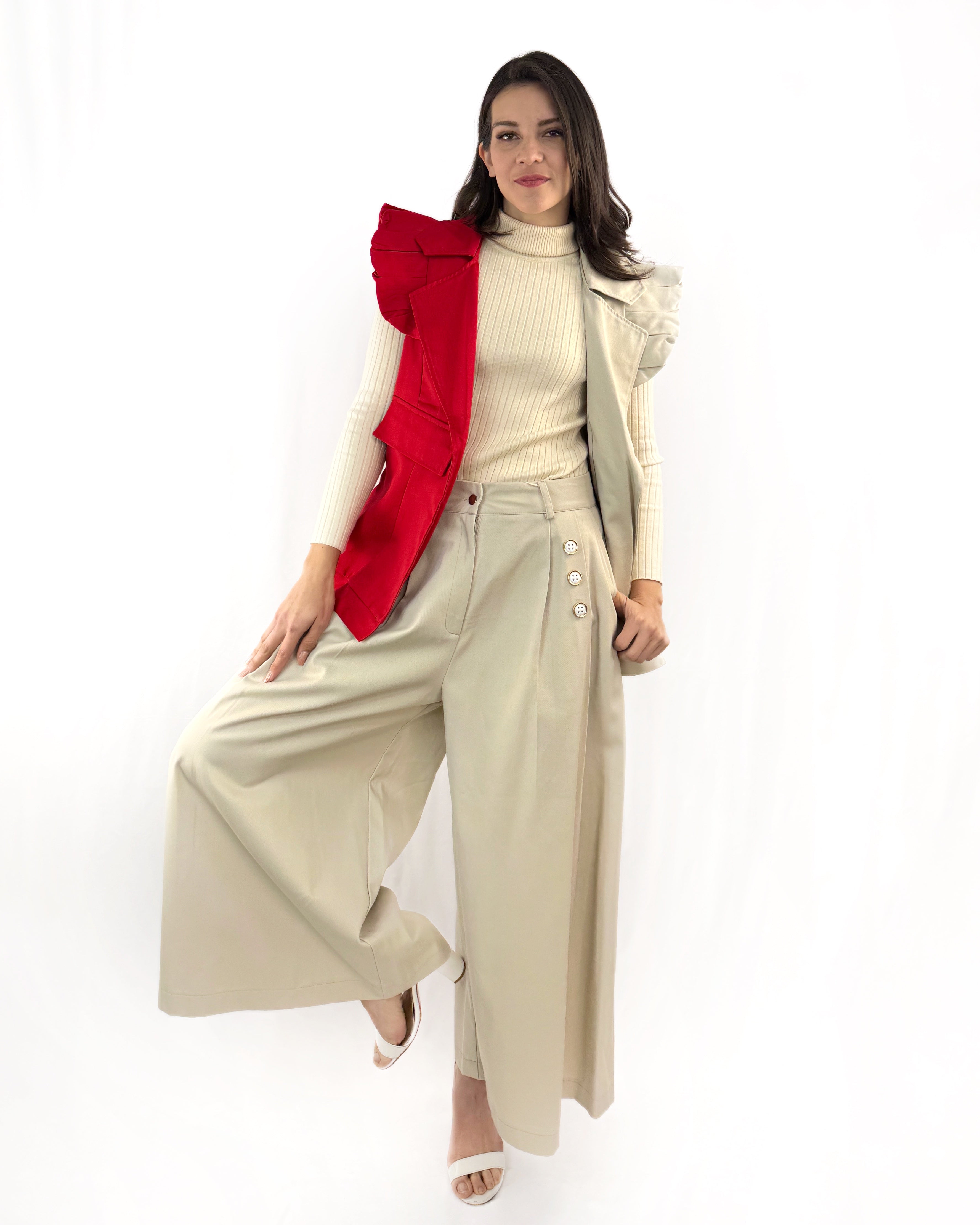 Chaleco confeccionado en gabardina 100% algodón, diseñado para aportar estructura, estilo y un toque contemporáneo. Su diseño bicolor crea un contraste visual elegante que eleva cualquier look de forma inmediata.