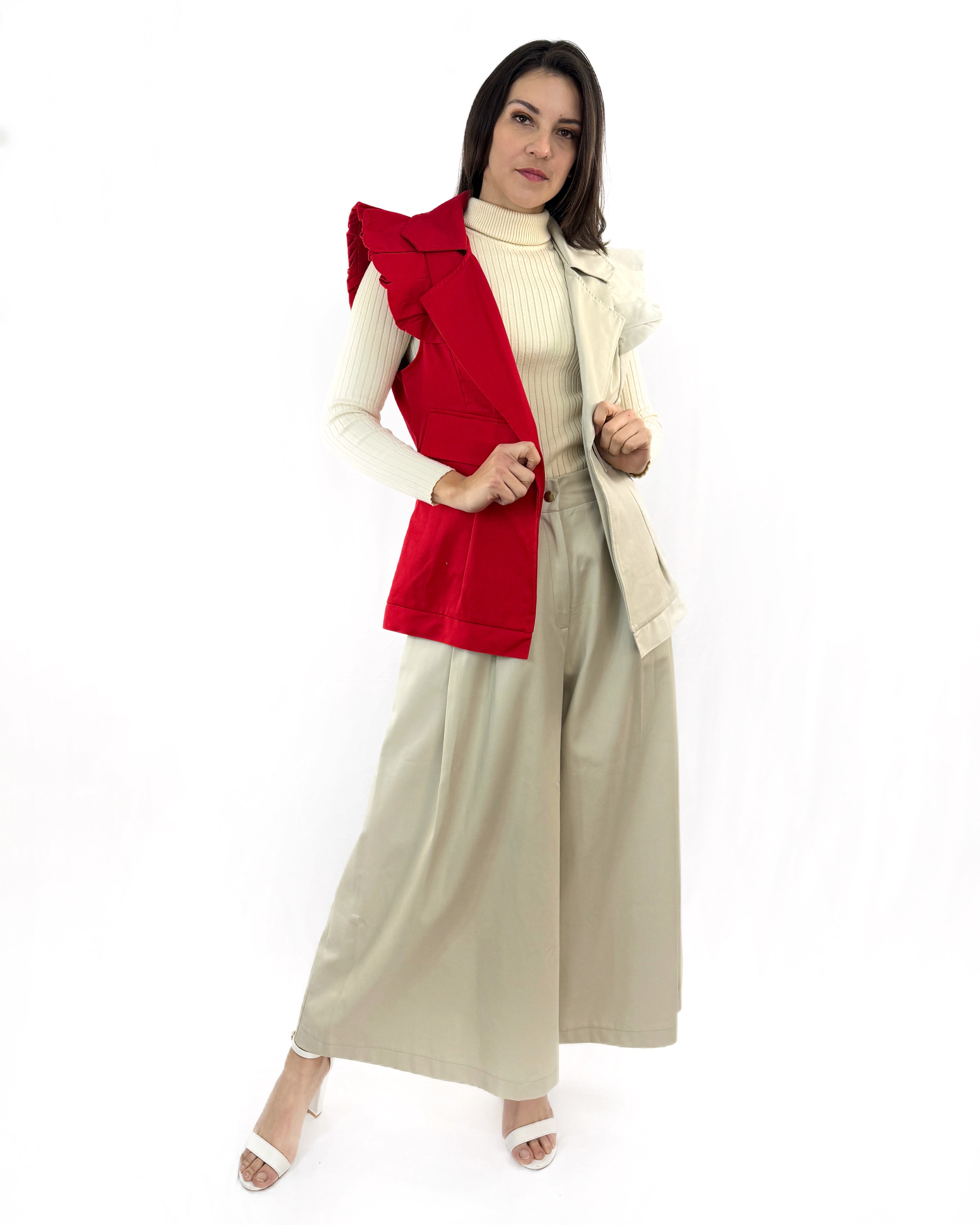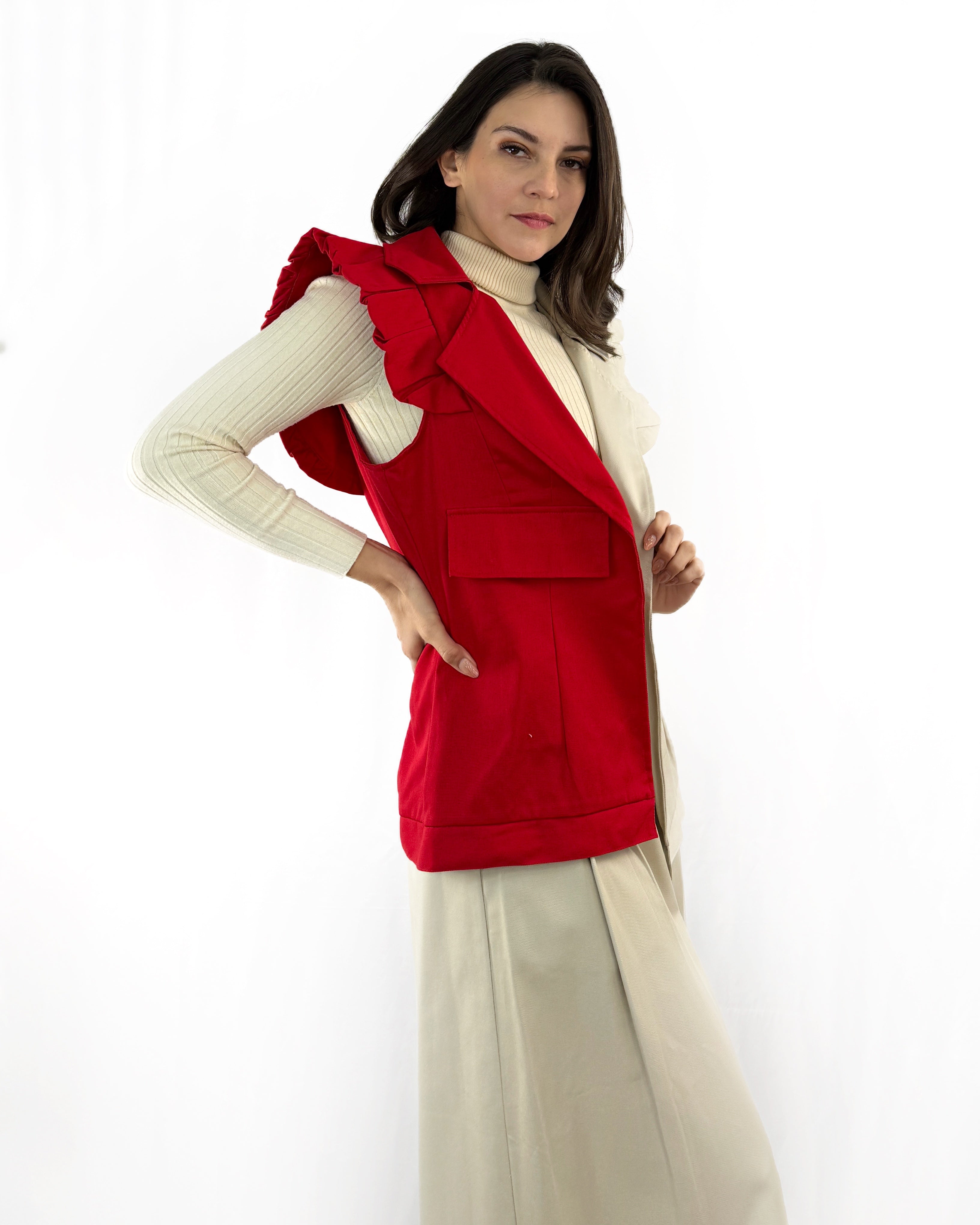 Destaca por sus hombreras con olanes, que aportan volumen y carácter, enmarcando los hombros y creando una silueta fuerte y sofisticada. Su corte recto y largo medio lo convierte en una prenda versátil, ideal para llevar sobre blusas, tejidos ligeros o como pieza protagonista del outfit.