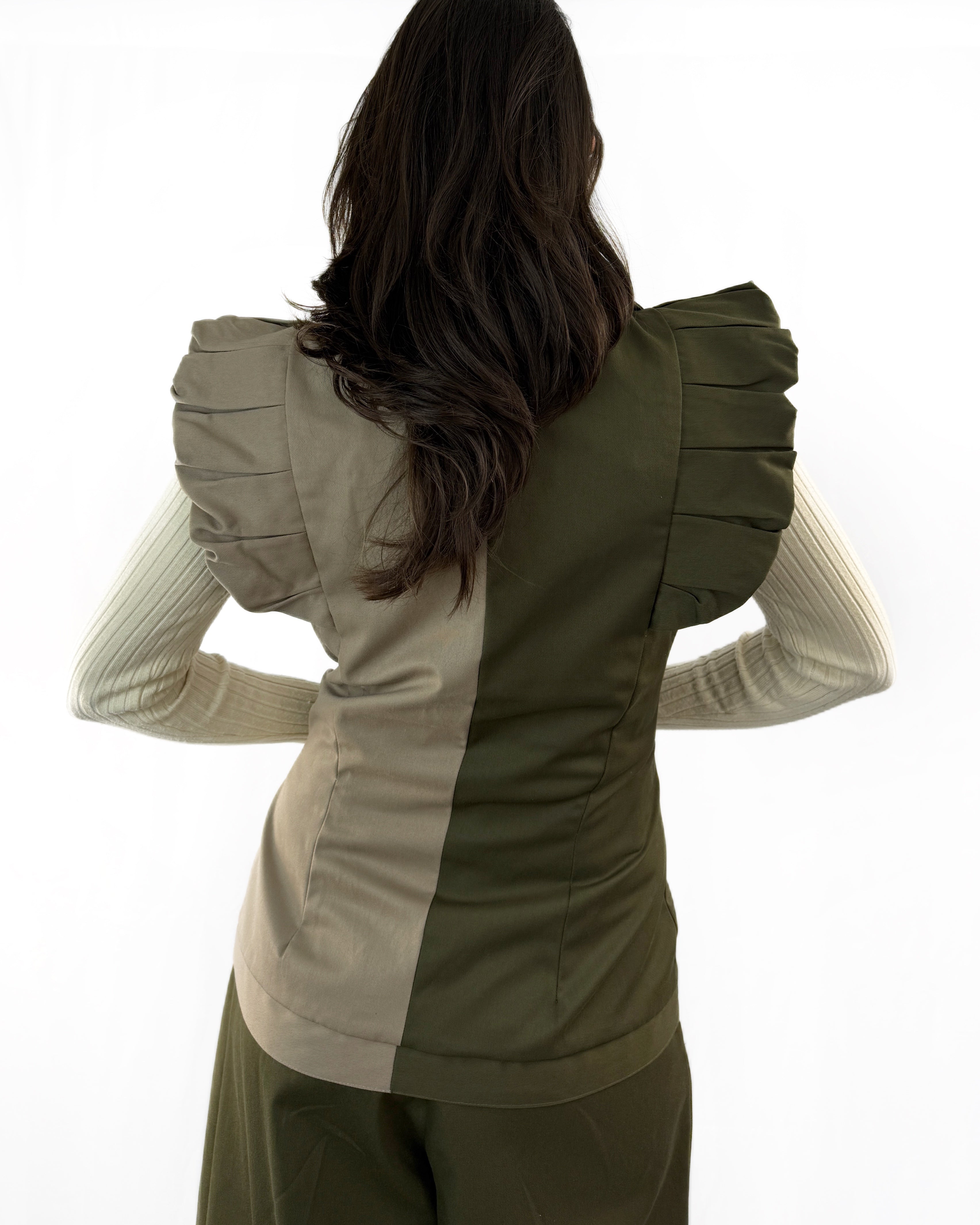 Destaca por sus hombreras con olanes, que aportan volumen y carácter, enmarcando los hombros y creando una silueta fuerte y sofisticada. Su corte recto y largo medio lo convierte en una prenda versátil, ideal para llevar sobre blusas, tejidos ligeros o como pieza protagonista del outfit.