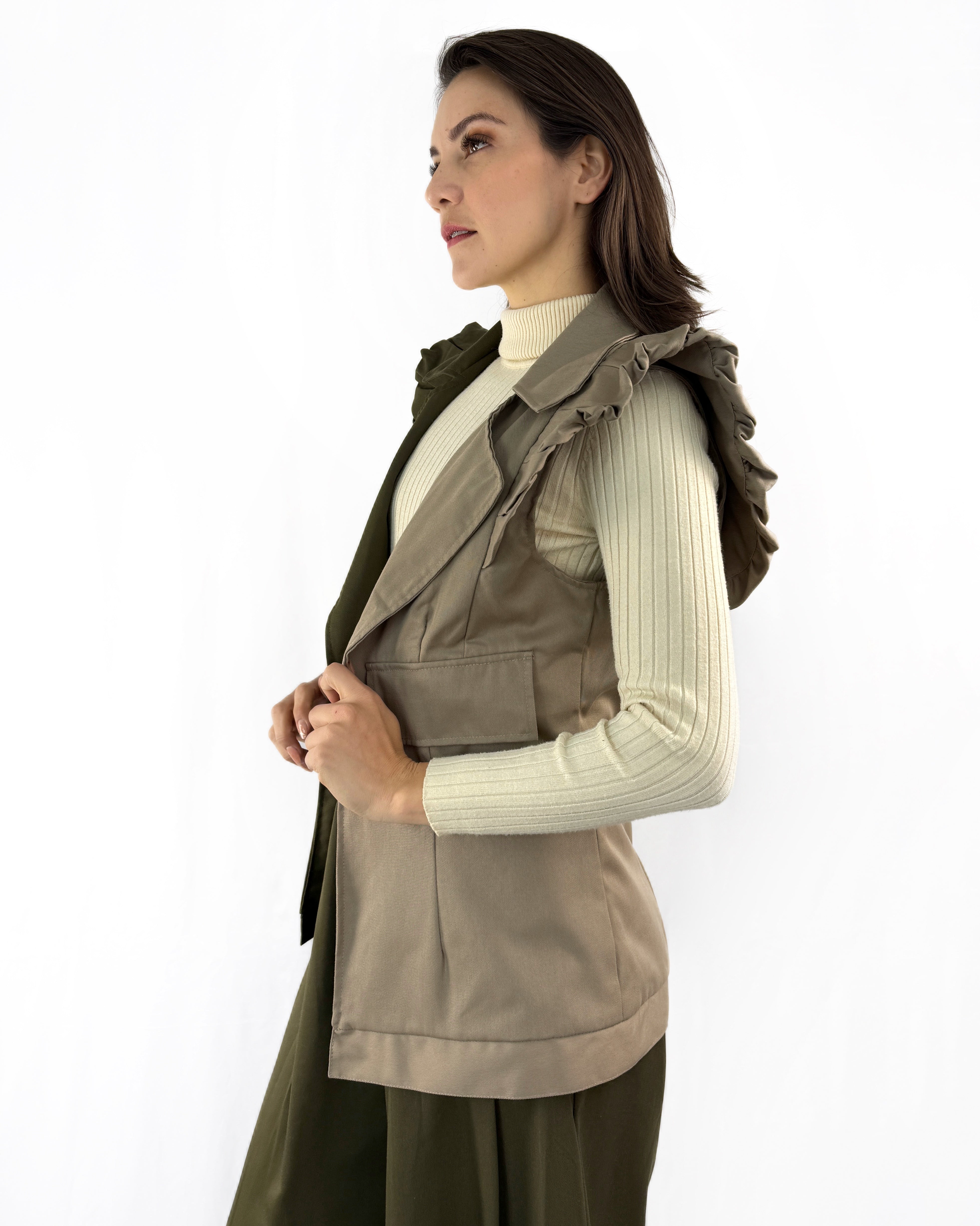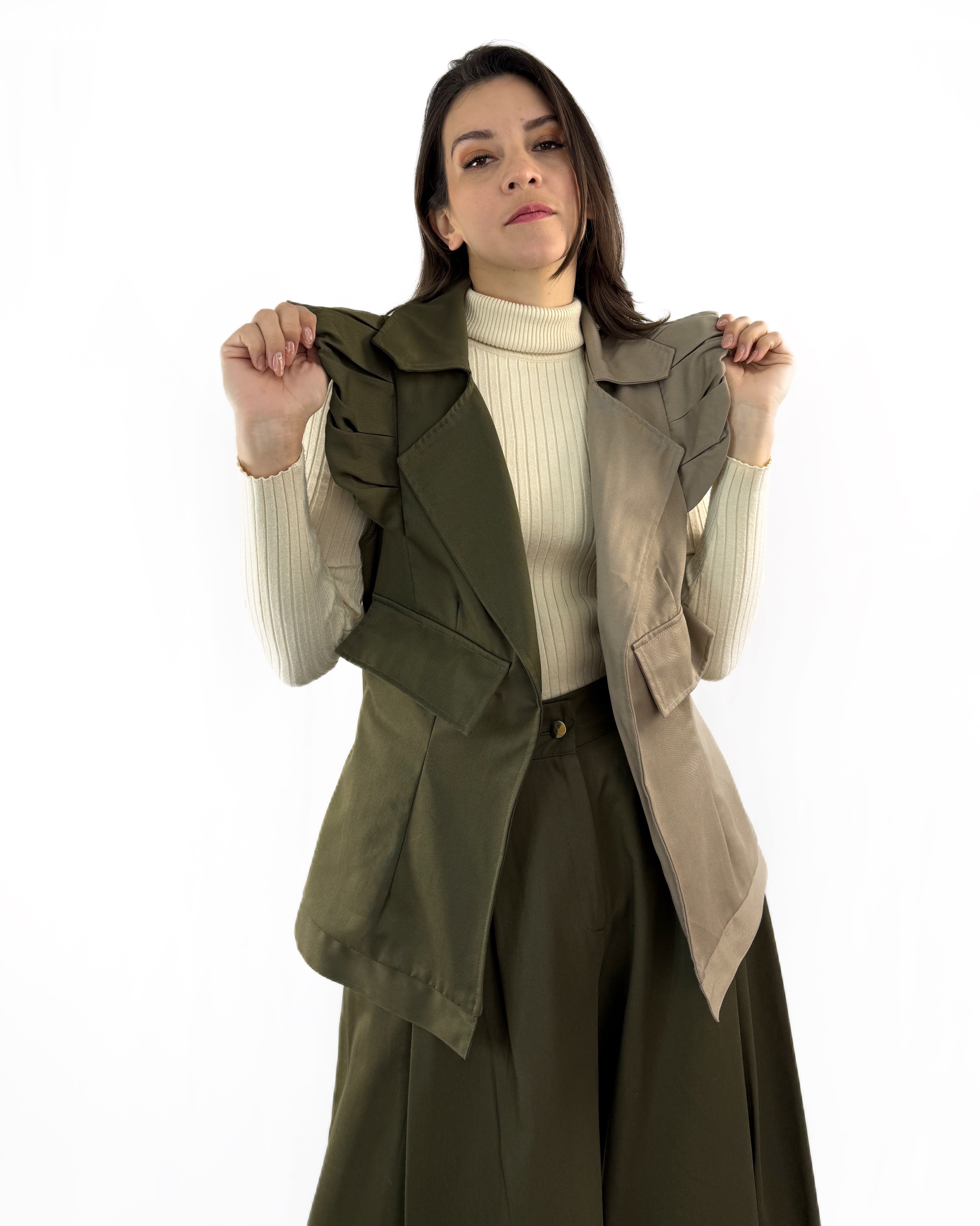 Chaleco confeccionado en gabardina 100% algodón, diseñado para aportar estructura, estilo y un toque contemporáneo. Su diseño bicolor crea un contraste visual elegante que eleva cualquier look de forma inmediata.