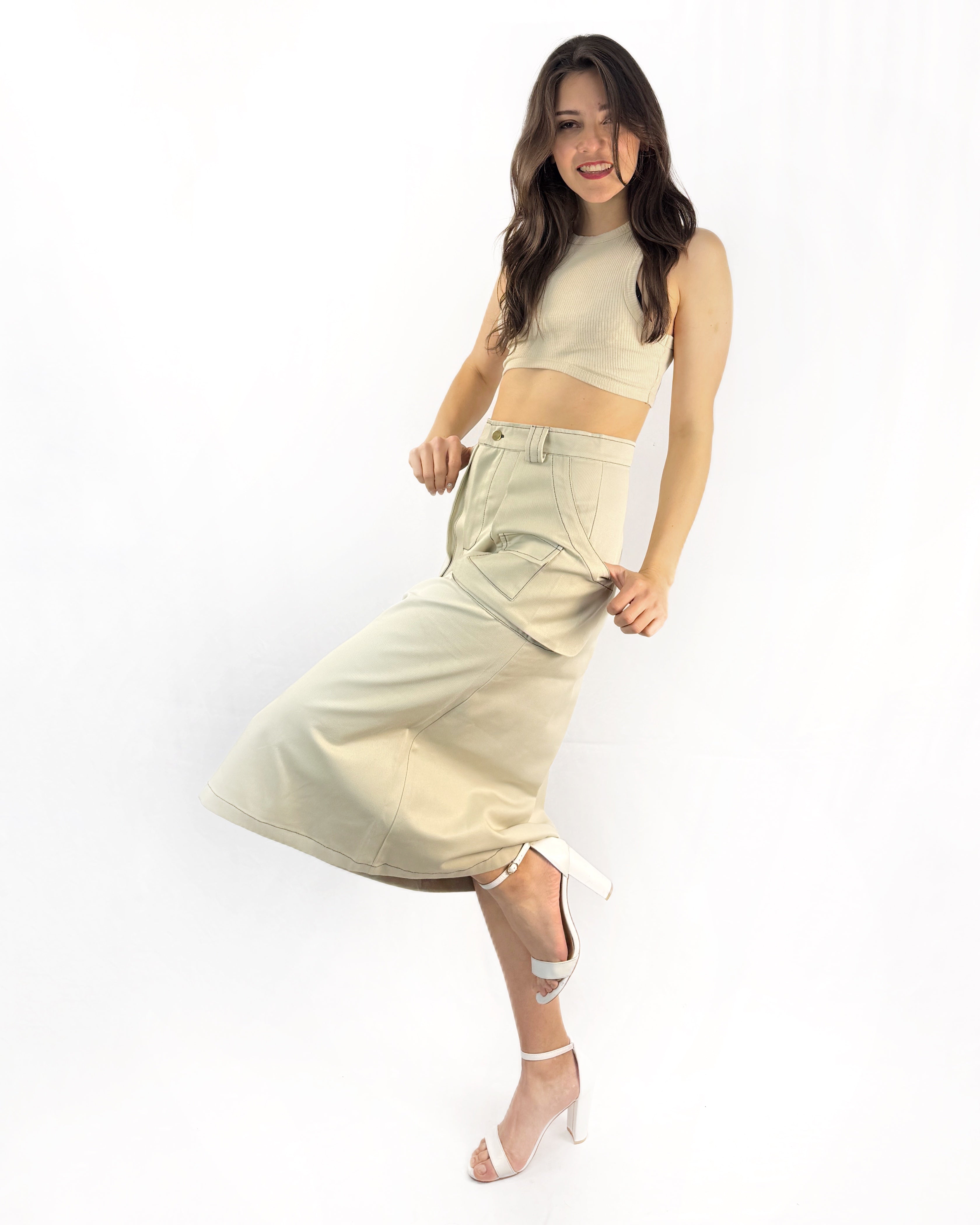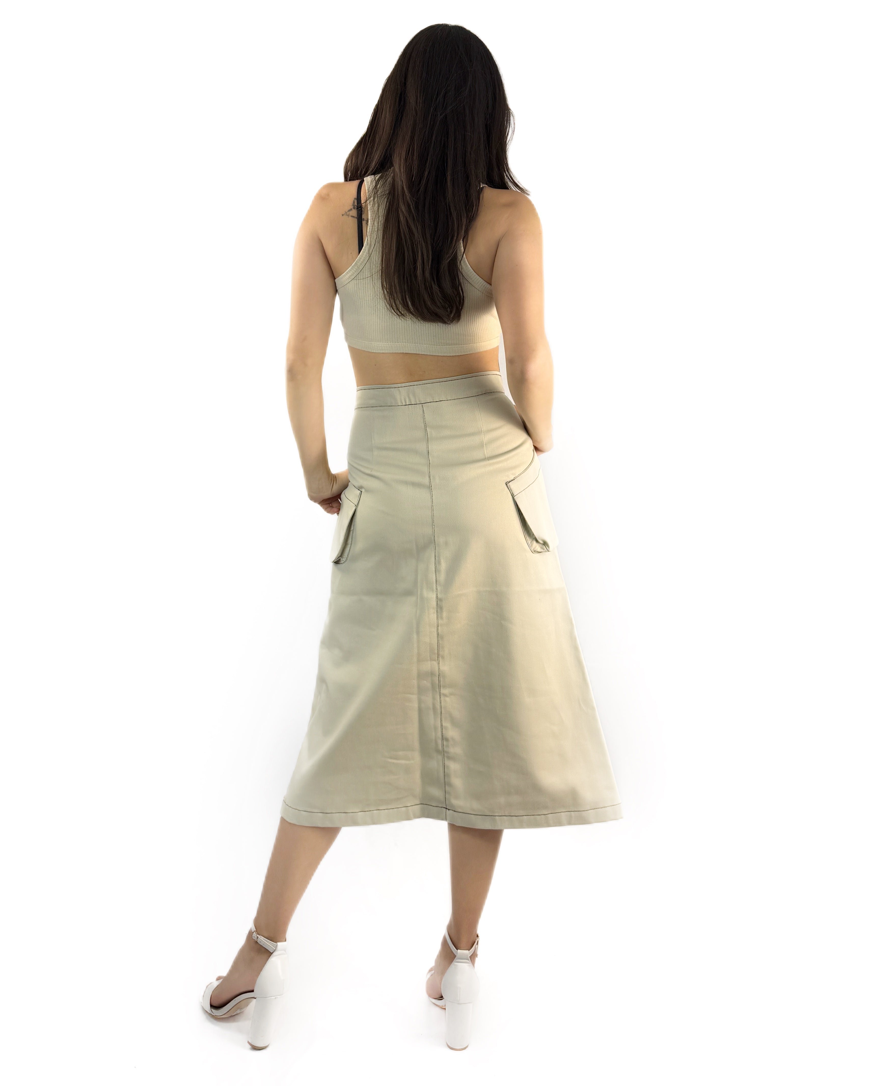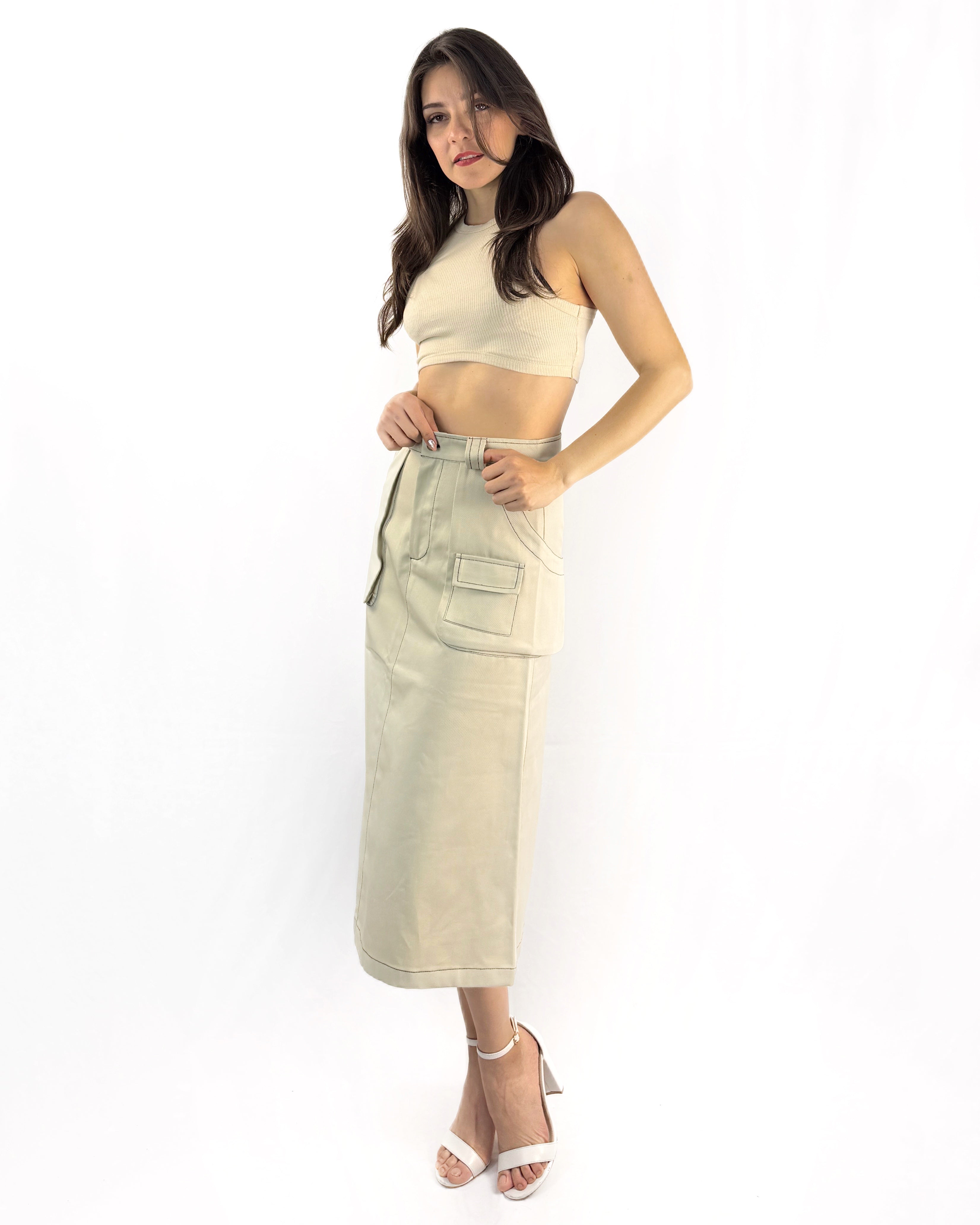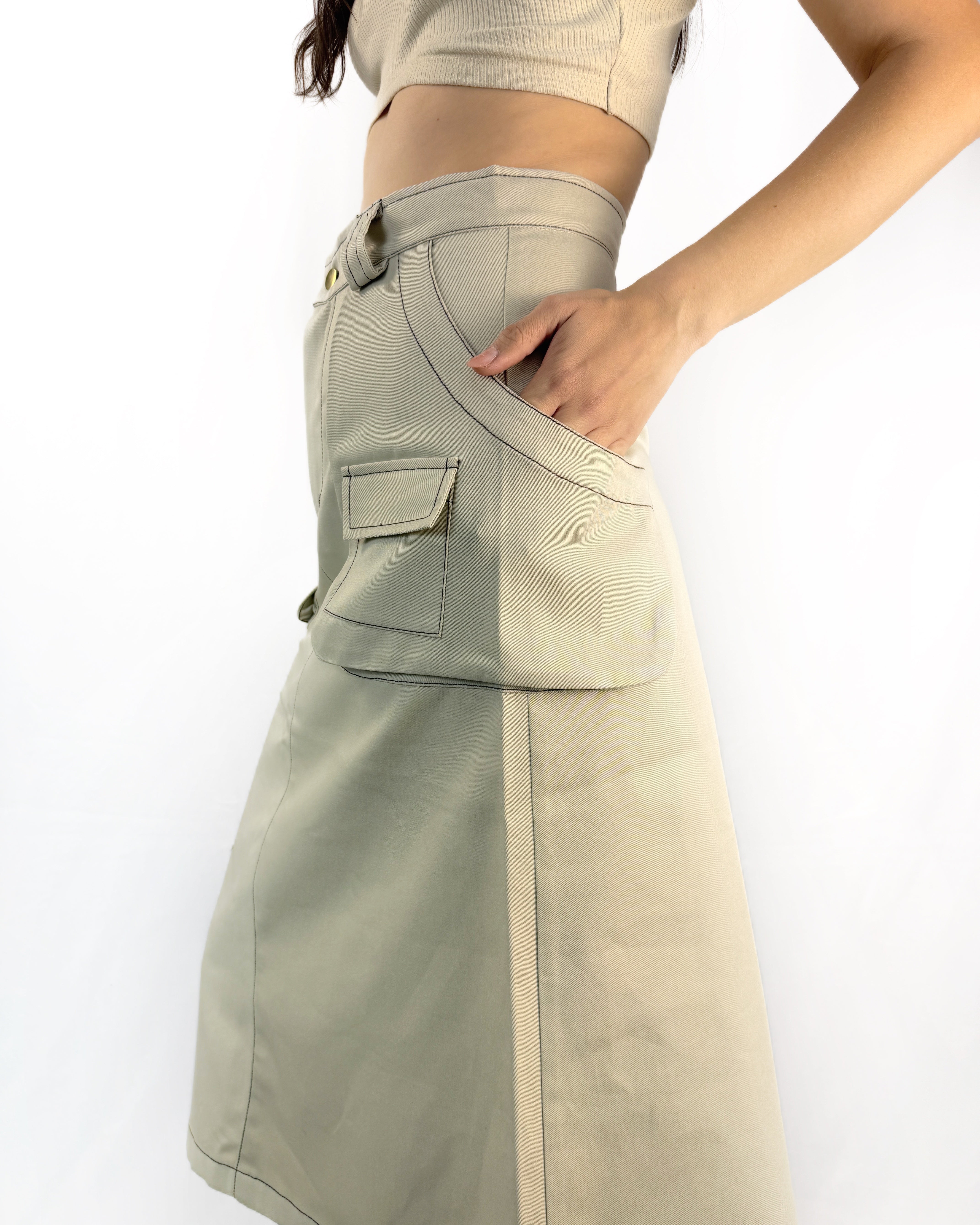 Cuenta con bolsas tipo cargo al frente, que aportan un toque funcional y contemporáneo, además de costuras visibles que realzan el diseño y le dan carácter. Su largo midi la convierte en una prenda versátil, ideal para combinar tanto con tops ajustados como con blusas o sacos.