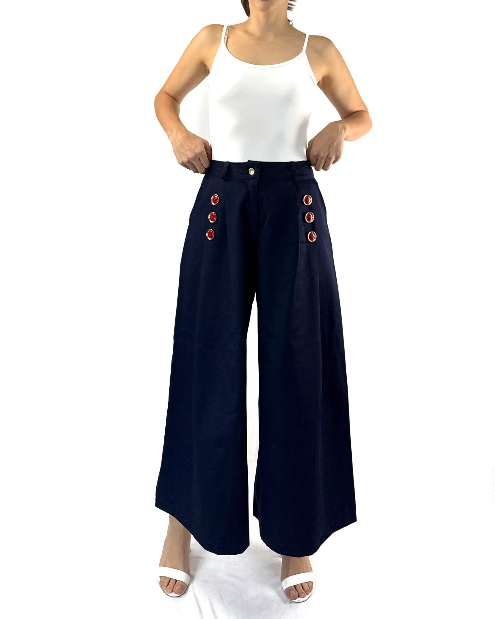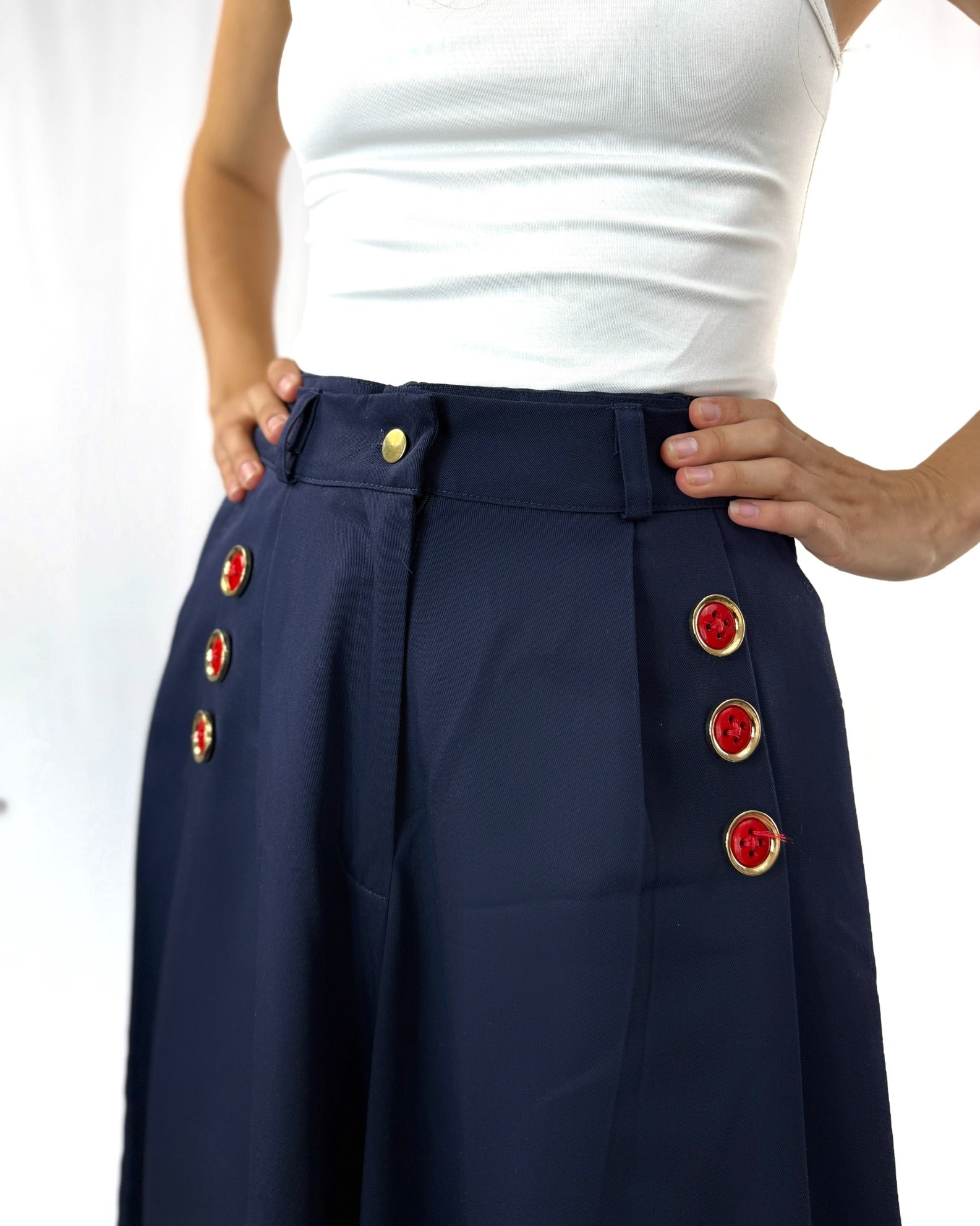 Como detalle distintivo, incorpora botones decorativos al frente que aportan carácter y un toque sofisticado al diseño. La cintura alta define y realza la silueta, convirtiéndolo en una prenda versátil ideal para looks casuales elevados o combinaciones más formales.