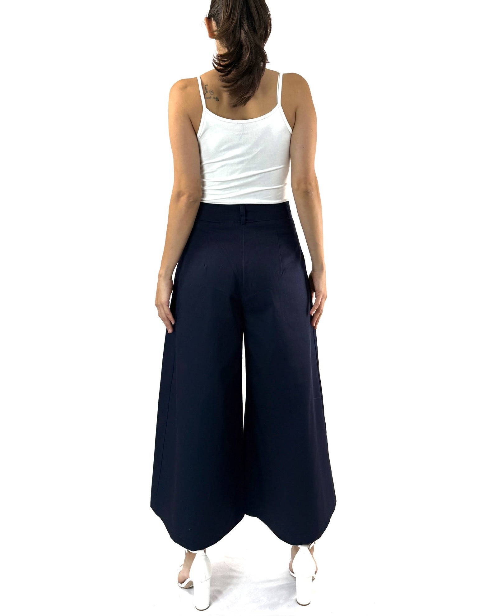 Pantalón de tiro alto confeccionado en gabardina 100% algodón, diseñado para brindar estructura, comodidad y una silueta estilizada. Su corte holgado se amplía gradualmente hacia el final de la pierna, creando un efecto fluido y elegante que alarga visualmente la figura.
