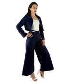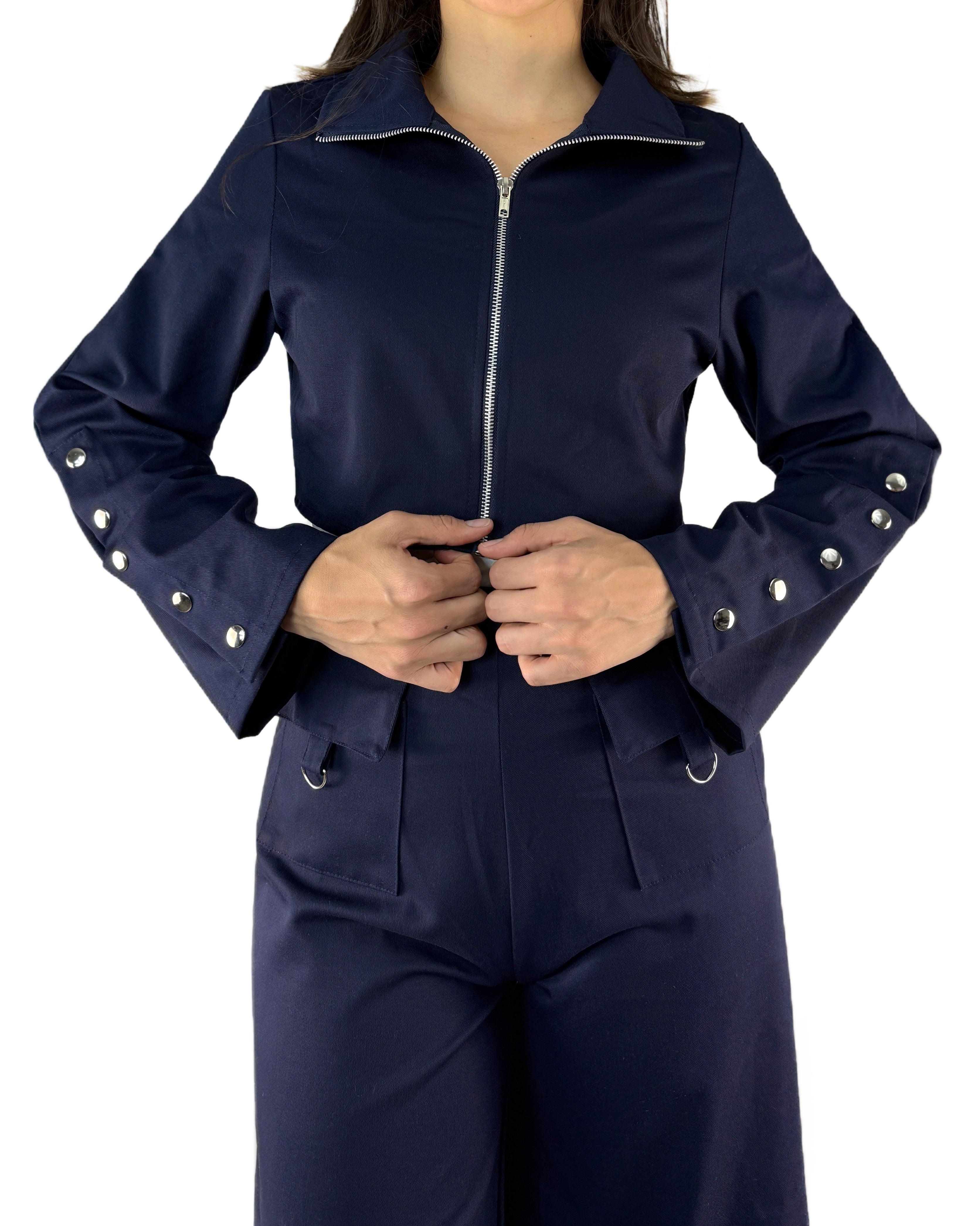 Cuenta con cierre frontal que permite llevarla abierta o cerrada, adaptándose a distintos estilos. Las mangas destacan por su diseño especial con botones funcionales que se abren, aportando movimiento y un detalle distintivo que eleva la prenda. Su corte favorece la silueta y la convierte en una pieza versátil, perfecta para combinar con pantalones de tiro alto o conjuntos coordinados.