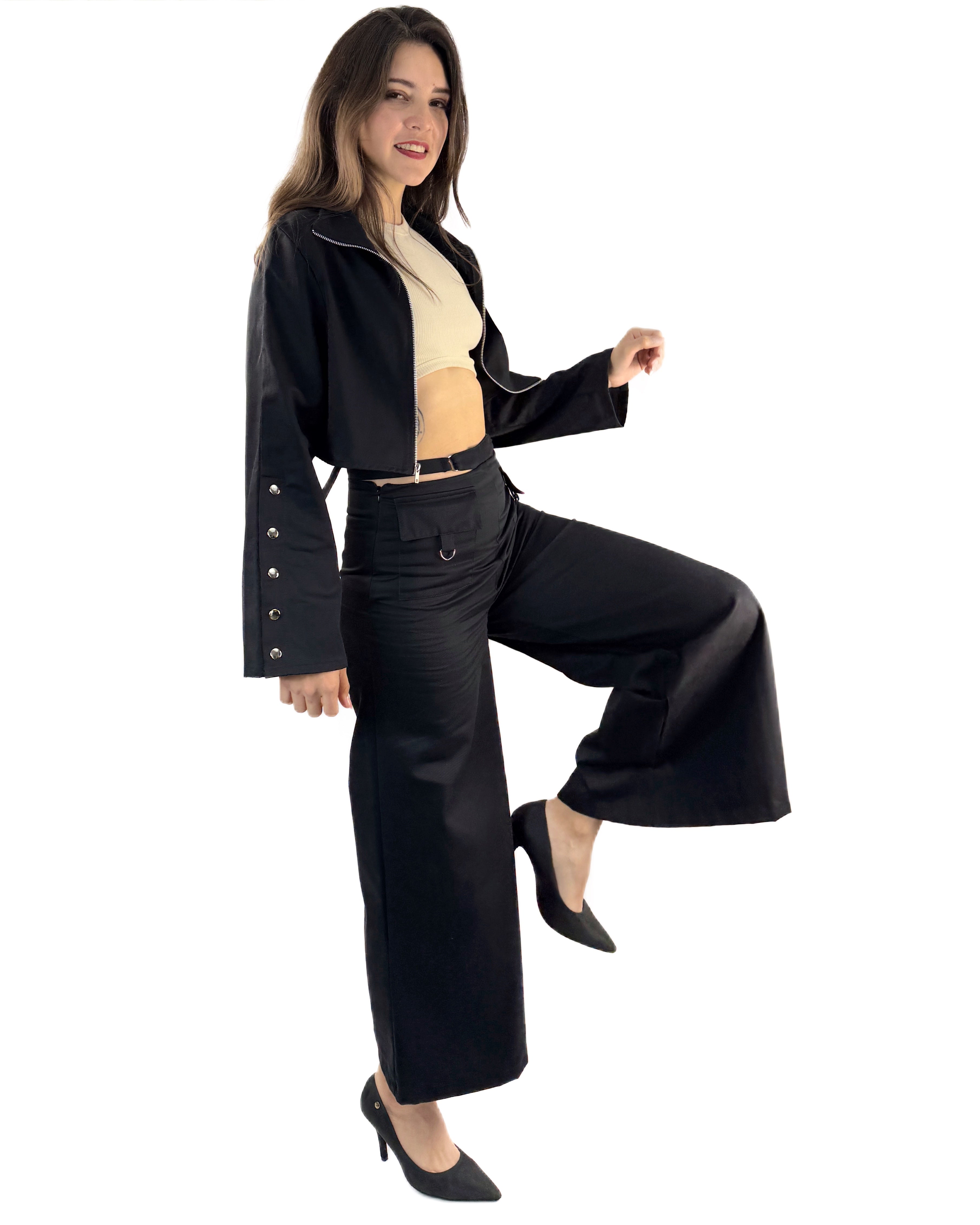 Cuenta con cierre frontal que permite llevarla abierta o cerrada, adaptándose a distintos estilos. Las mangas destacan por su diseño especial con botones funcionales que se abren, aportando movimiento y un detalle distintivo que eleva la prenda. Su corte favorece la silueta y la convierte en una pieza versátil, perfecta para combinar con pantalones de tiro alto o conjuntos coordinados.