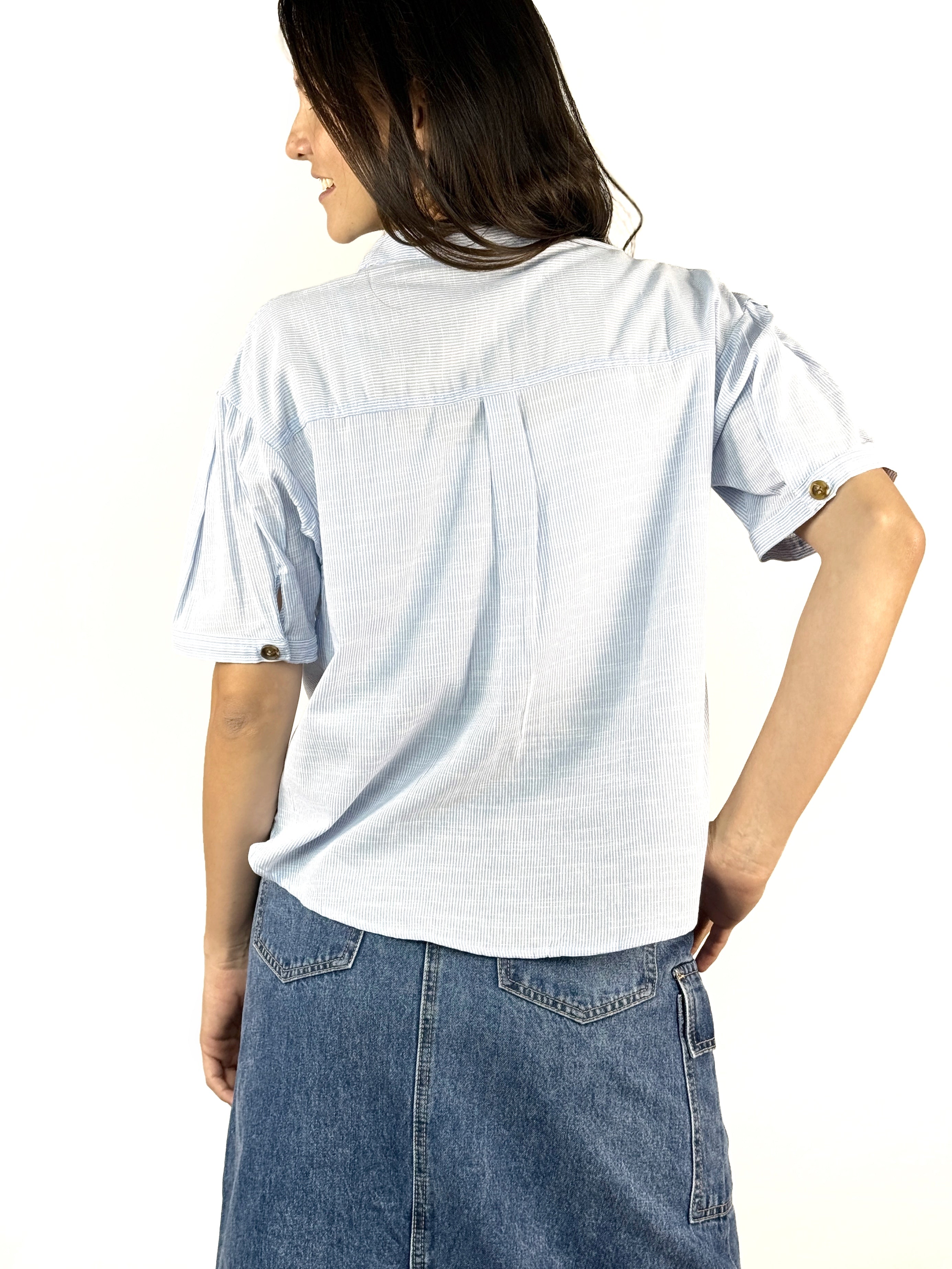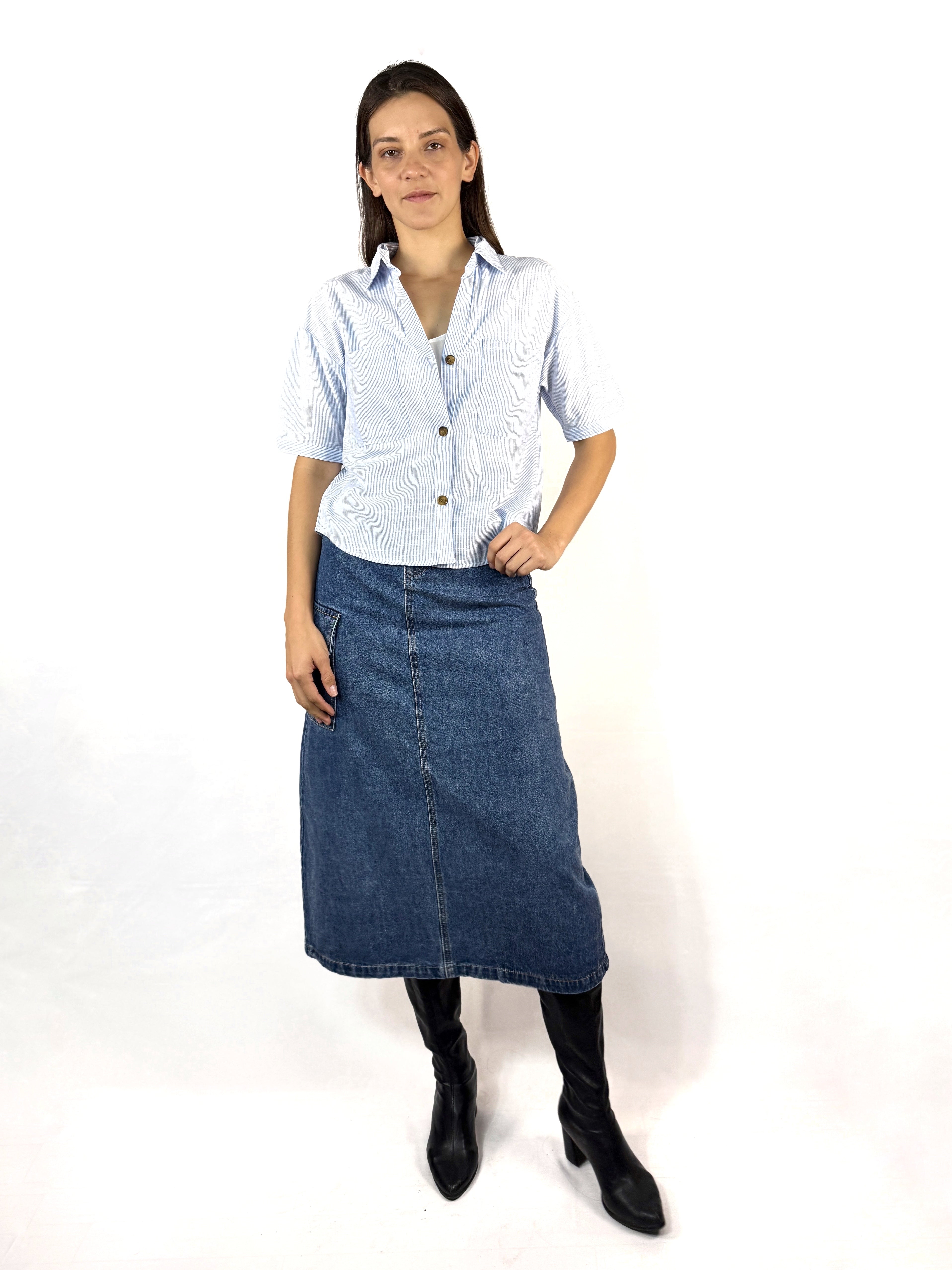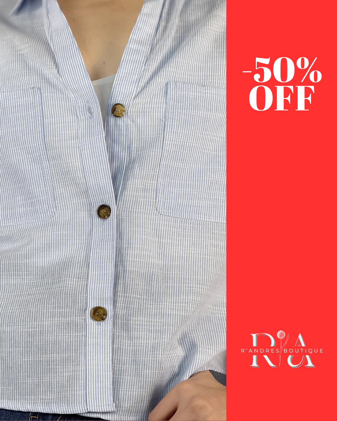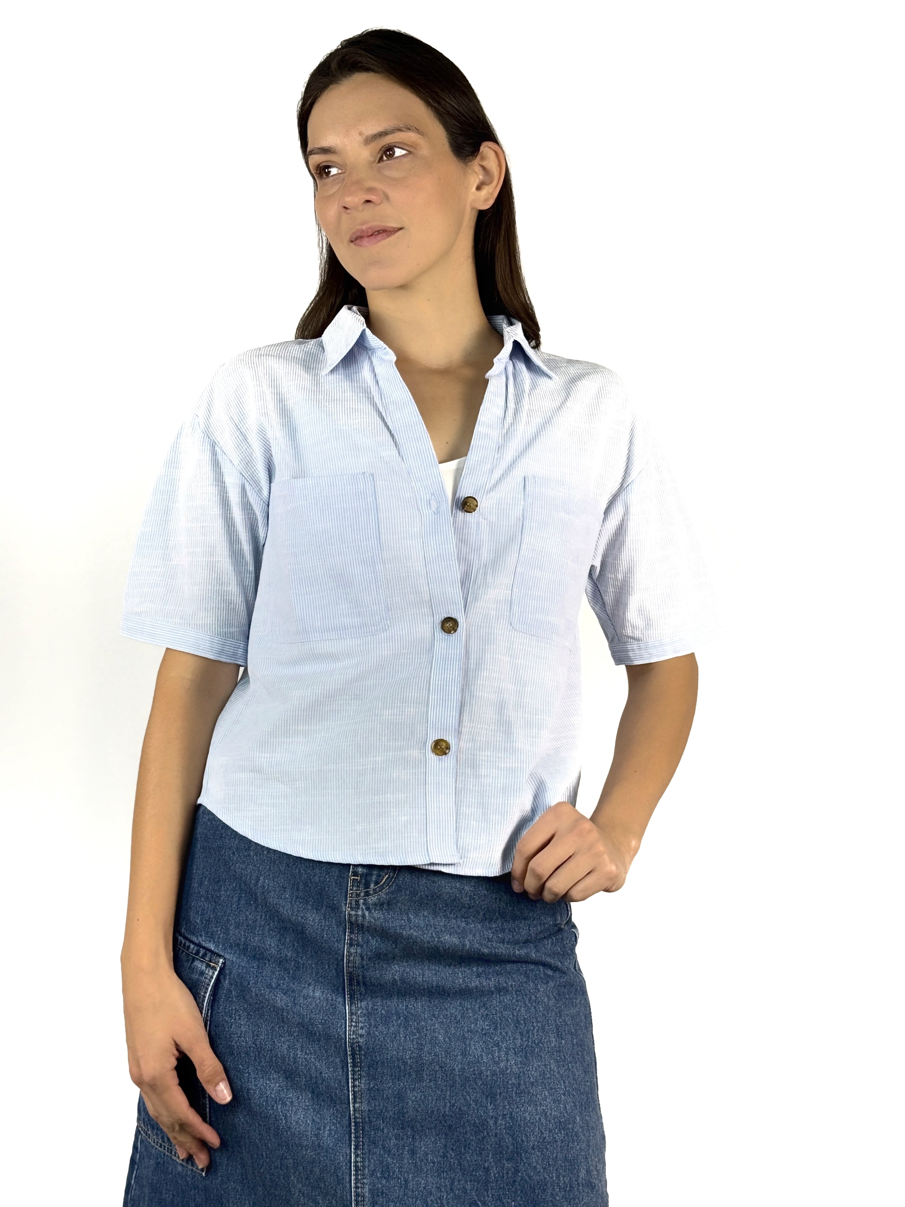 Es una camisa ligera de rayas azules que transmiten frescura y naturalidad. Su corte relajado y botones en tono madera le dan ese aire casual que se adapta a cualquier día de verano. Ideal para llevar con mezclilla, faldas o shorts, abierta sobre un top o como protagonista de un look simple y chic.