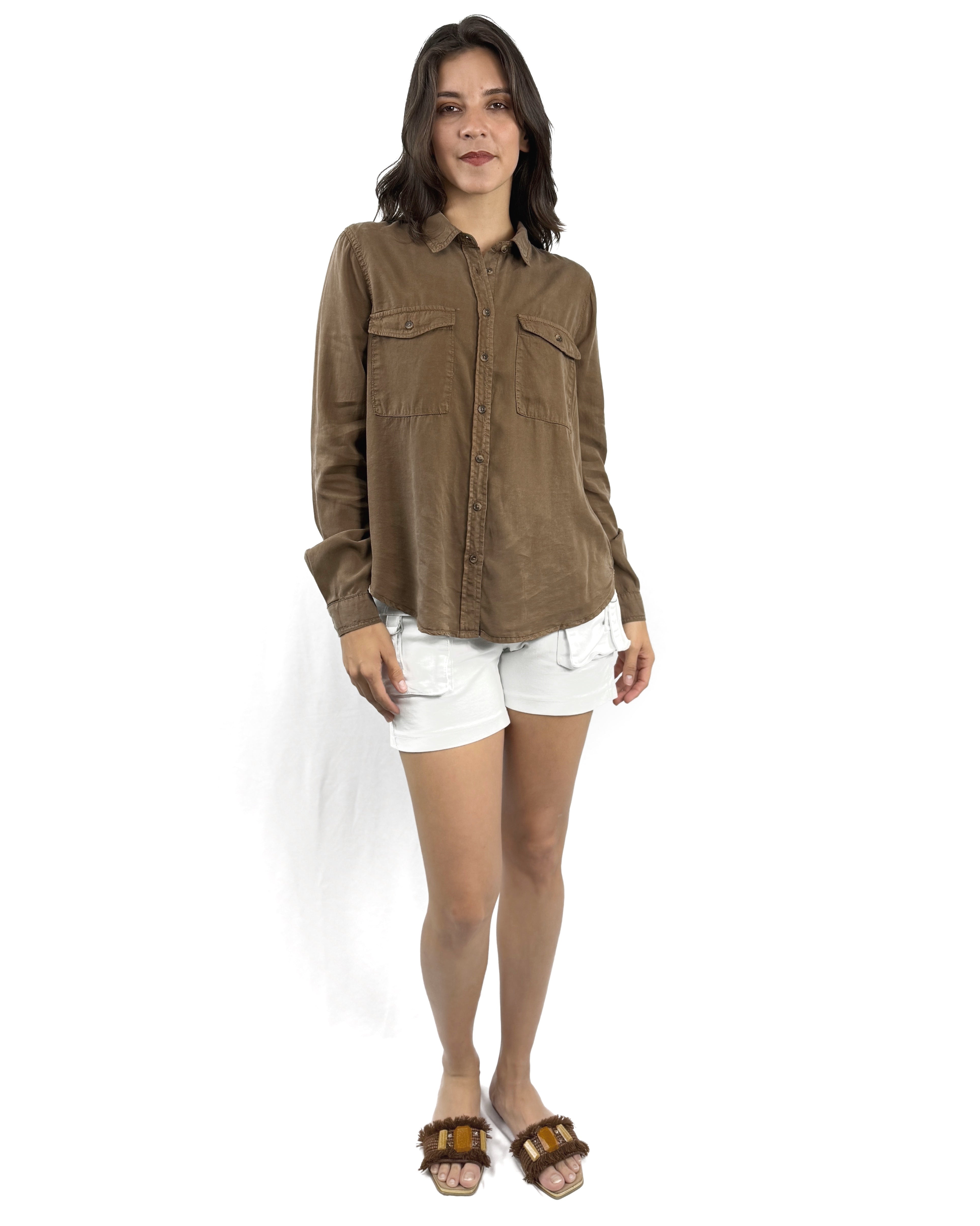 El básico esencial reinterpretado. Denim Frame es una camisa cafe que aporta estructura y suavidad a cualquier outfit. Llévala abierta, cerrada o anudada: se adapta a tu estilo con un aire atemporal.