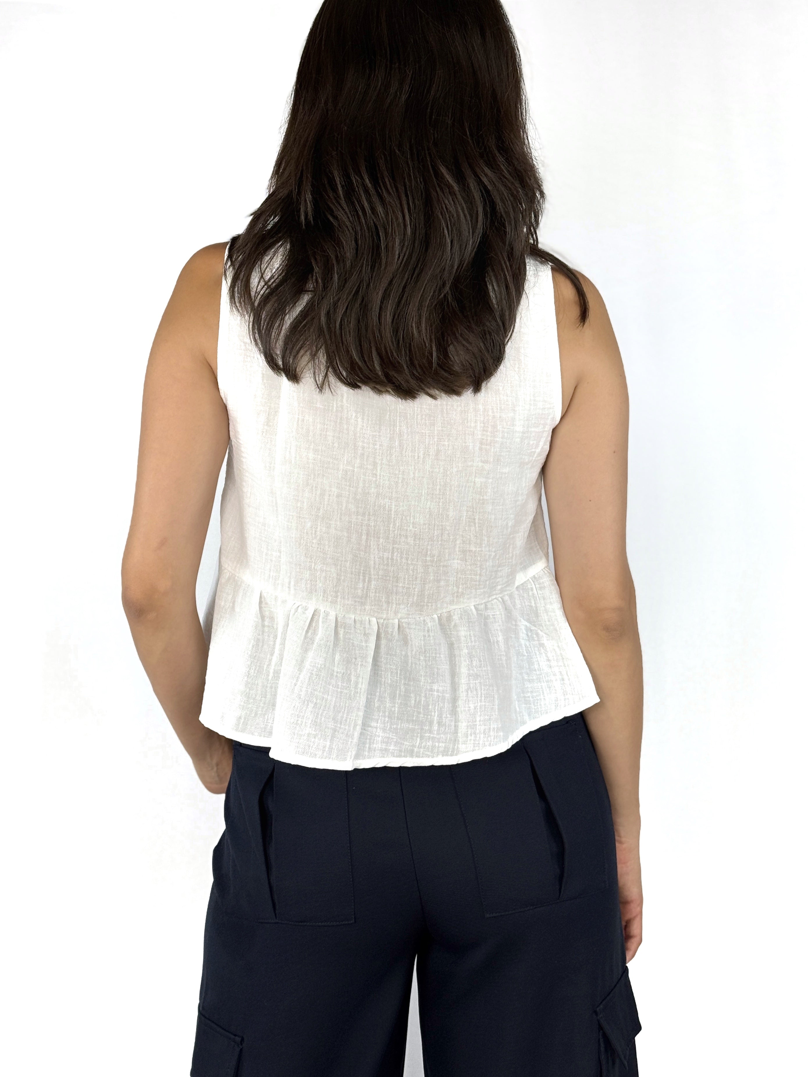 Pure Bow es una blusa sin mangas que combina frescura y dulzura en cada detalle. Su silueta ligera, confeccionada en una tela vaporosa, se adorna con delicados moños al frente y un sutil olan en el bajo. Ideal para crear looks románticos con un toque moderno, es perfecta para llevar con jeans, pantalones amplios o faldas.