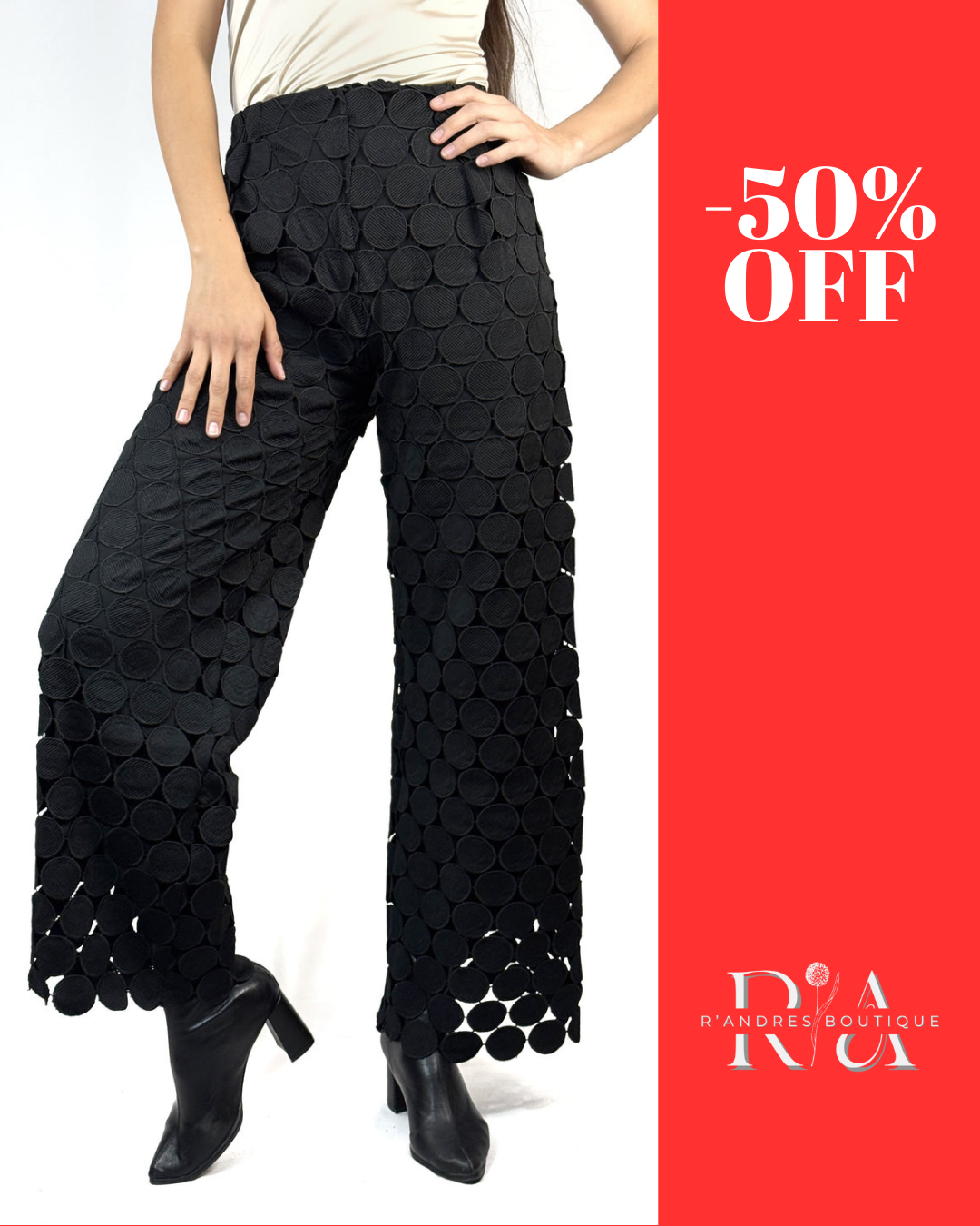 Ceniza es un pantalón negro de caída impecable y corte pulido. Su diseño sobrio y versátil le da fuerza a cualquier look, ya sea con un top llamativo o como parte de un conjunto monocromático.