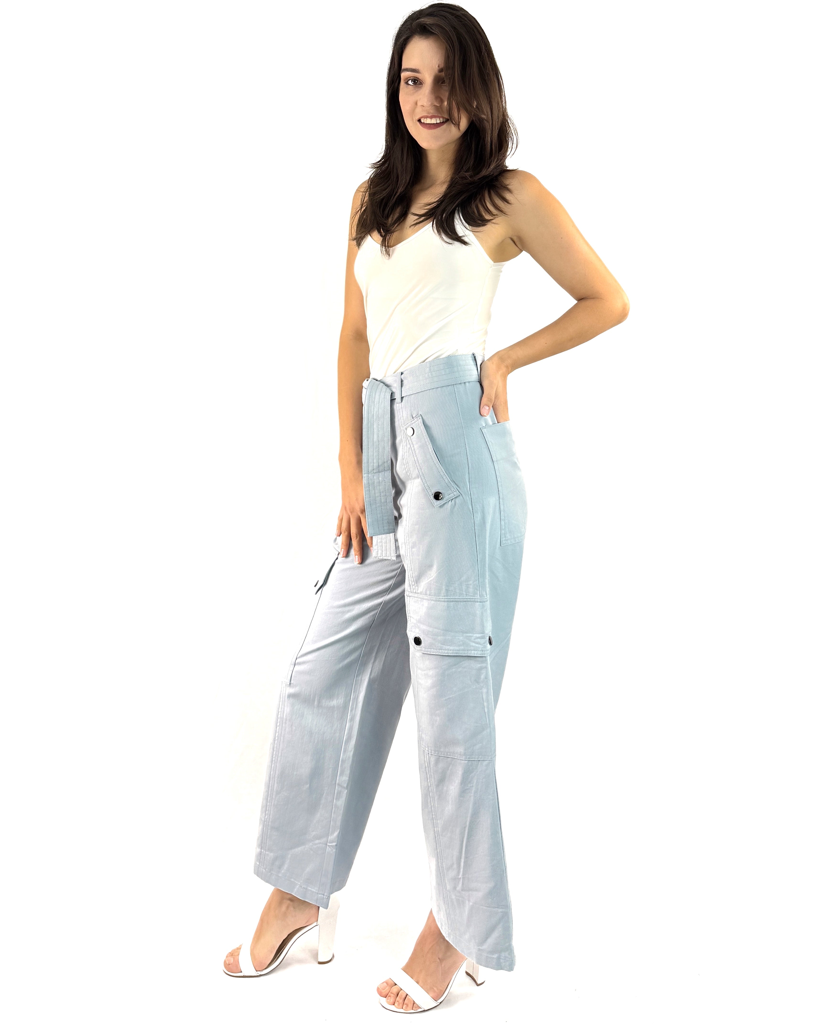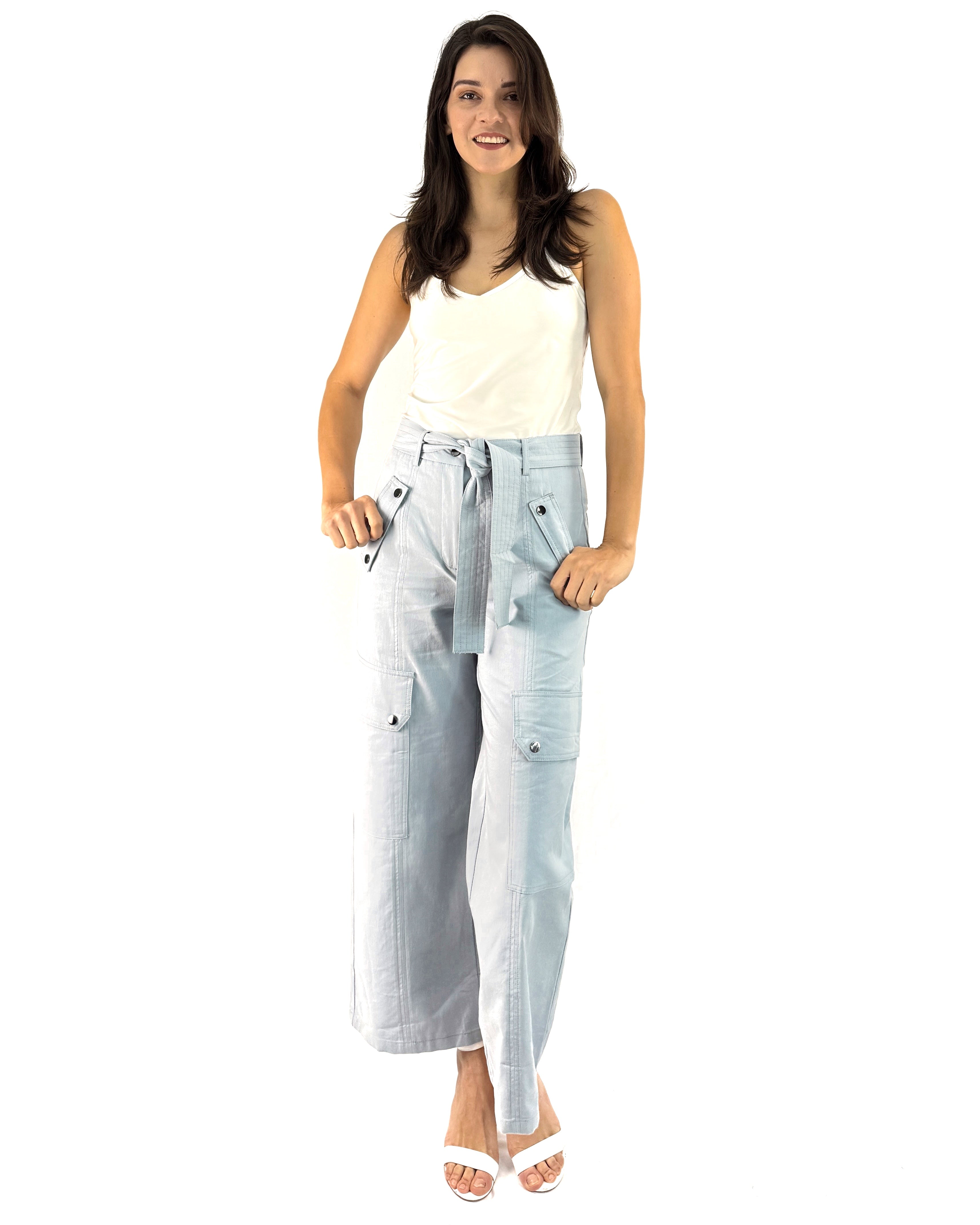 Frescura urbana con un toque elegante. Es un pantalón tipo cargo en tono azul claro, con bolsillos de solapa y cinturón del mismo material que marca la cintura con estilo. Su caída fluida y cómoda es perfecta para días activos sin sacrificar el diseño. Úsalo con tacones para elevar el look o con sneakers para un vibe relajado.
