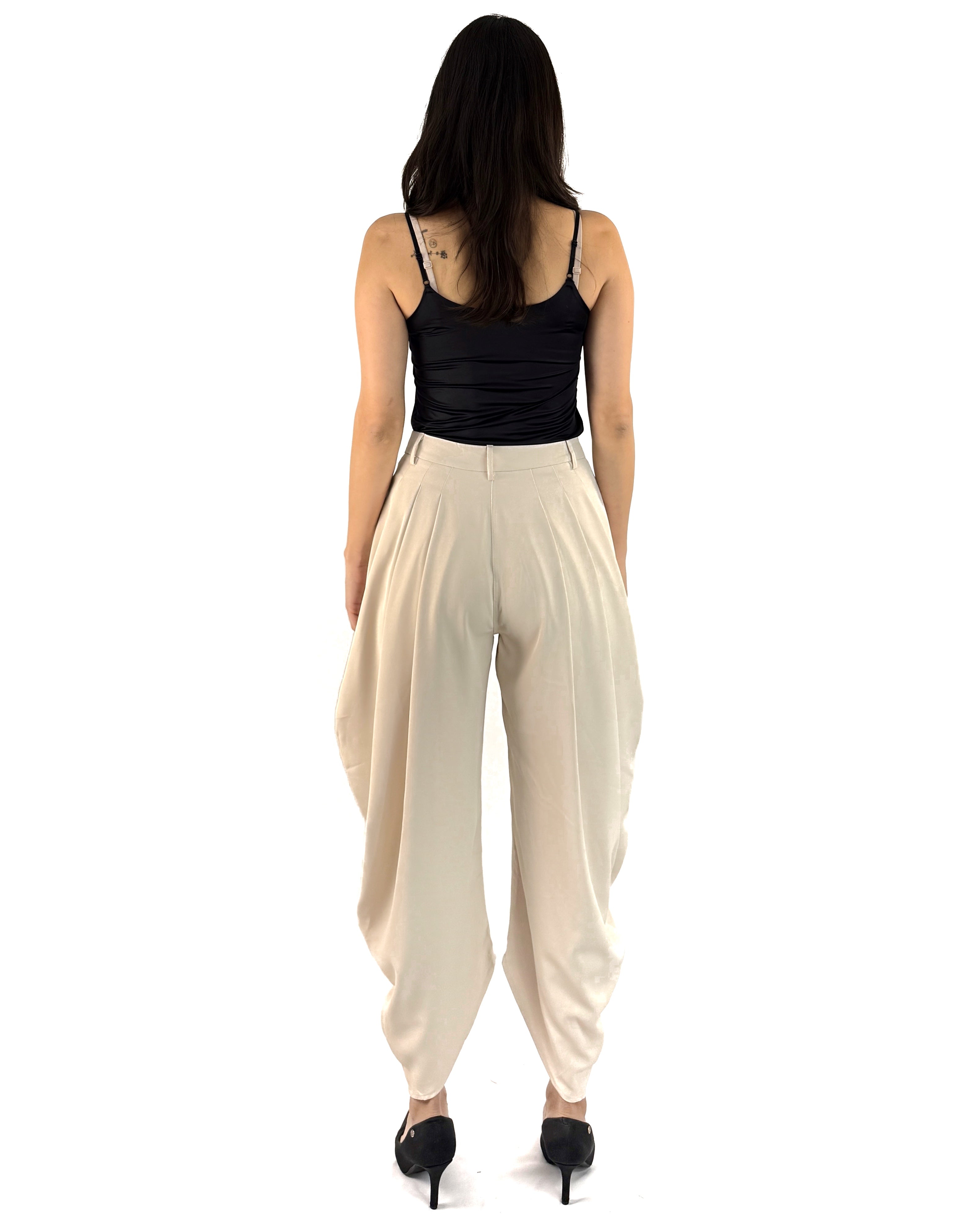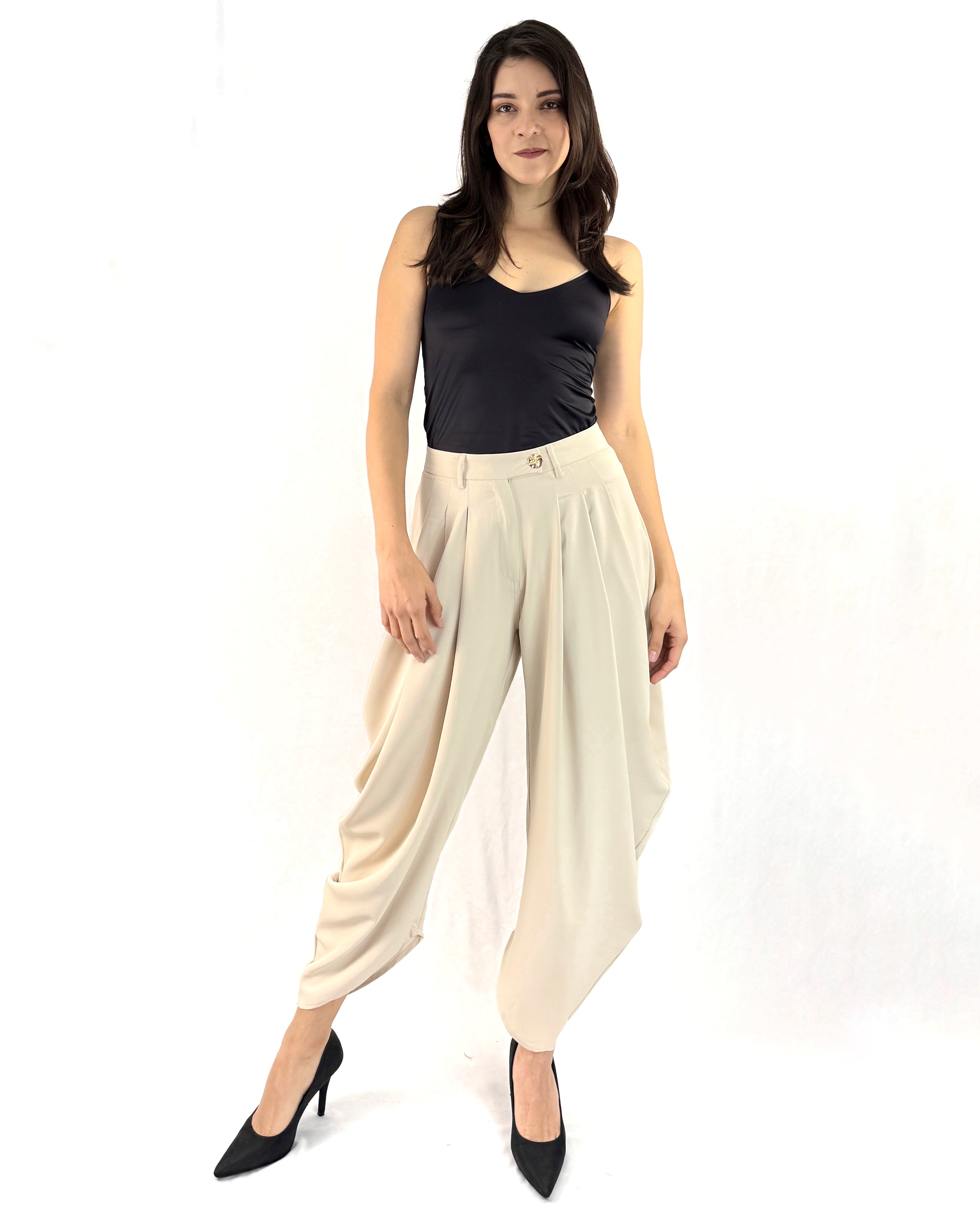 Reinventa la silueta clásica con un giro atrevido y elegante. Su diseño tipo globo con pinzas y pliegues estratégicos le da un volumen fluido que estiliza y añade movimiento a cada paso. La pretina estructurada con botón joya realza la cintura y aporta un toque de sofisticación.