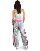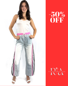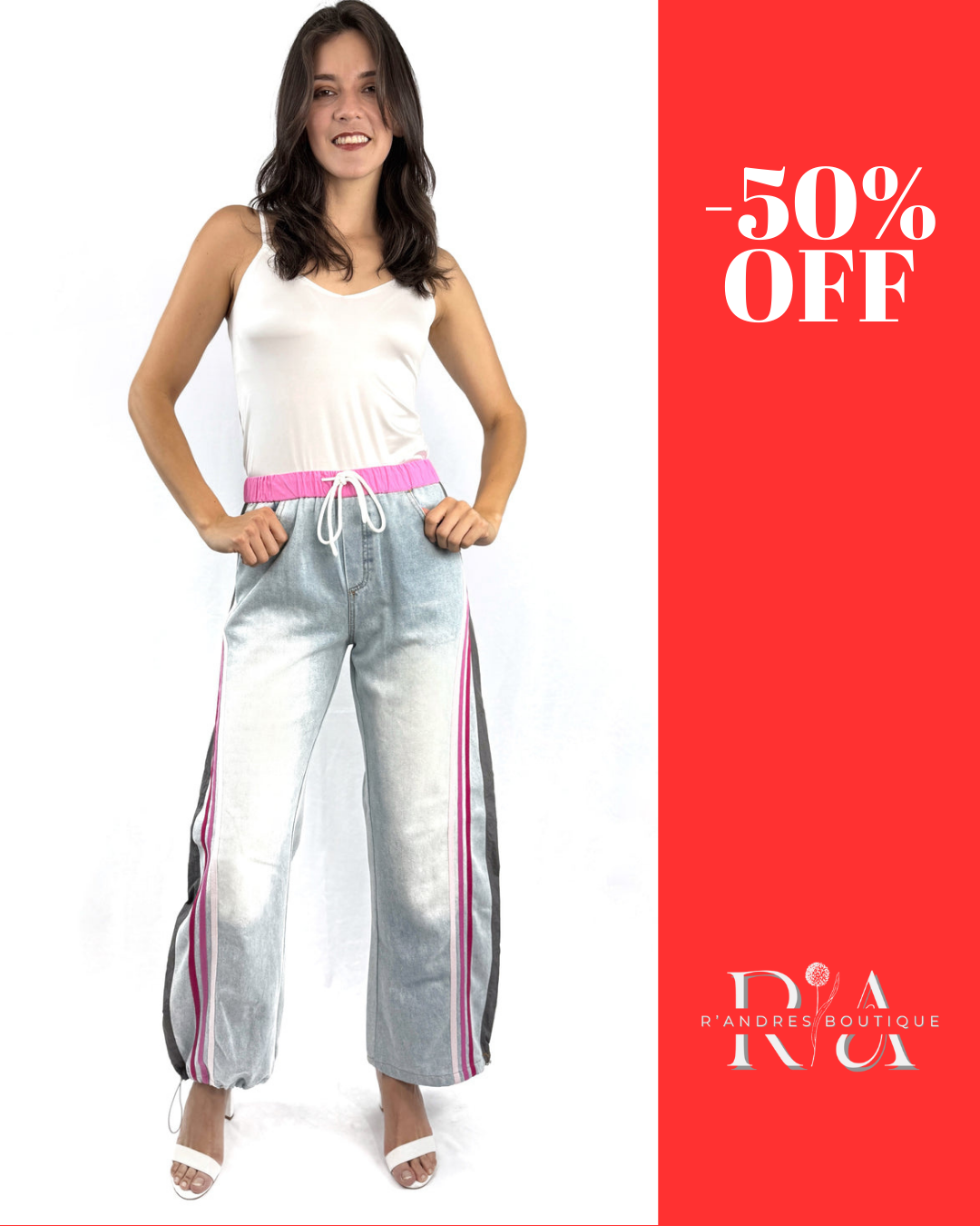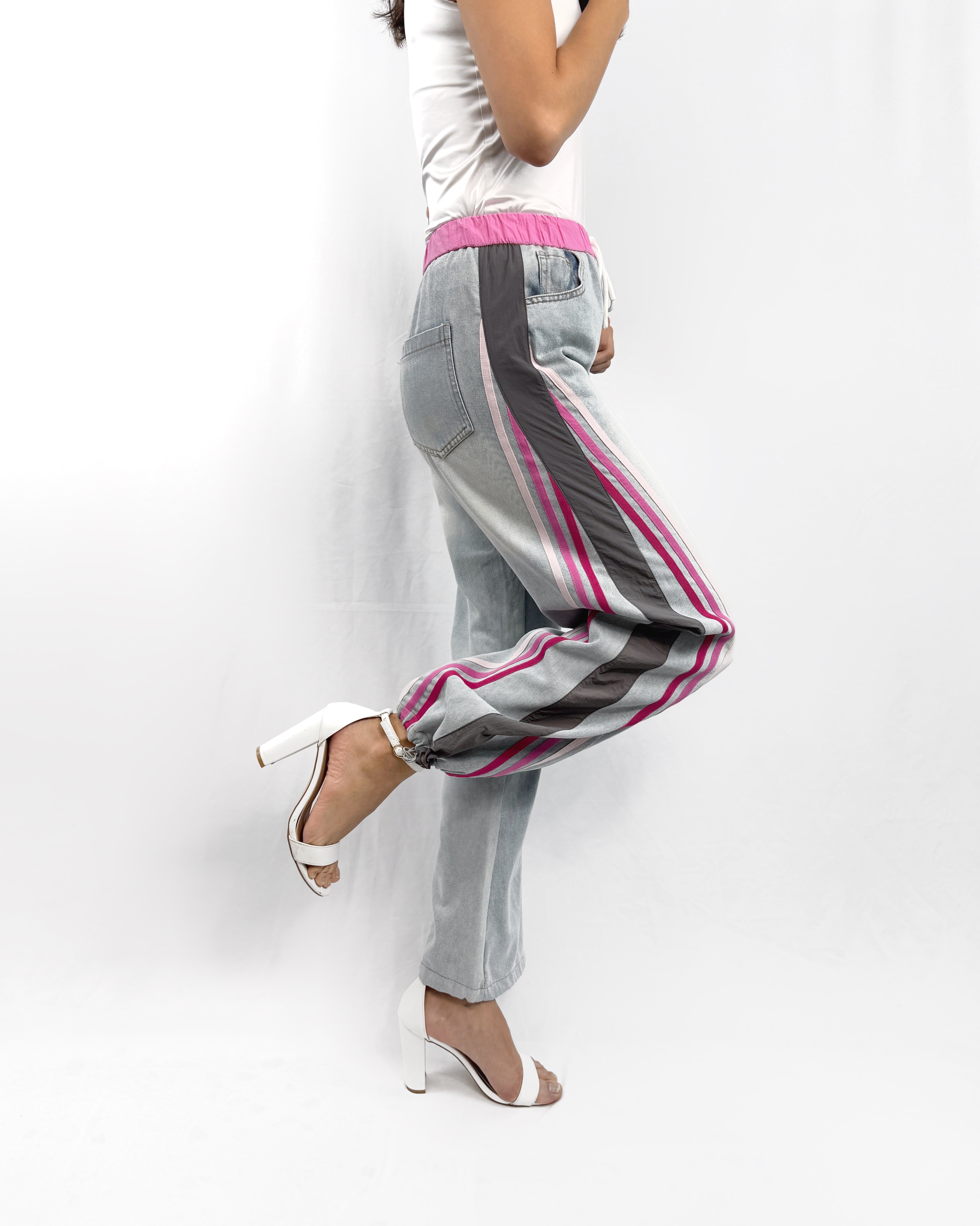 Pink Motion es la mezcla perfecta entre comodidad deportiva y estilo urbano elevado. Su diseño de mezclilla ligera se fusiona con detalles gráficos en tonos fucsia, gris y rosa pastel, creando un look vibrante y lleno de actitud. La pretina elástica y los tobillos ajustables aportan ese toque relajado, mientras las líneas laterales estilizan visualmente la silueta. Ideal para mujeres que buscan destacar sin perder libertad de movimiento.