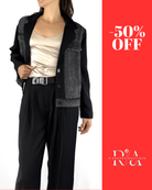 El saco mezcla la elegancia del blazer con la rebeldía del denim en un diseño que destaca por sus detalles sutiles y una silueta contemporánea.