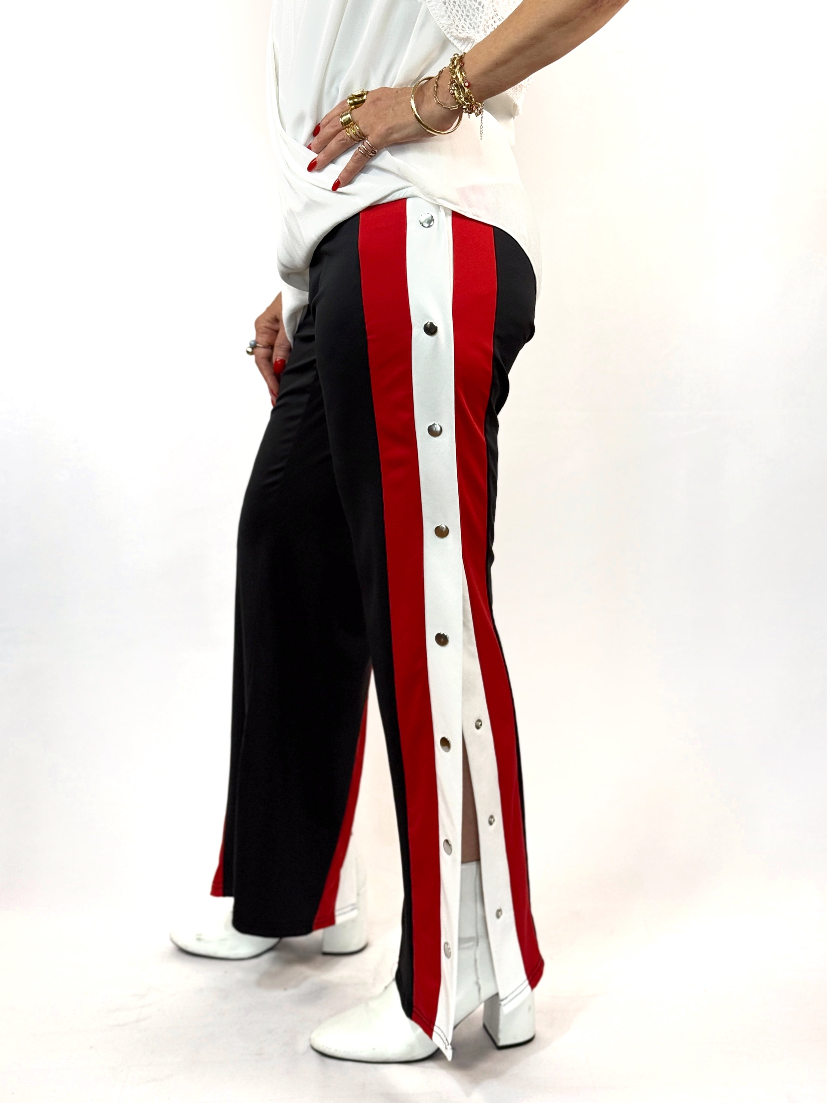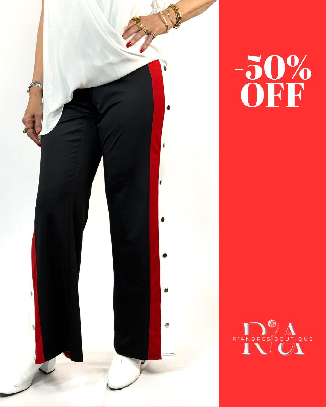 Diseño urbano con un giro inesperado. Street Snap es un pantalón de corte recto con costados abiertos y botones metálicos, ideal para llevar cerrado o con abertura según tu mood.