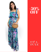Luce como una postal tropical con Bloom Cruise, un vestido largo que combina color, frescura y movimiento. Su escote con vuelo, tirantes con lazo y diseño fruncido realzan la silueta con un aire romántico. Ideal para paseos junto al mar o tardes cálidas, este vestido se convierte en tu aliado favorito para vibrar alto y libre.