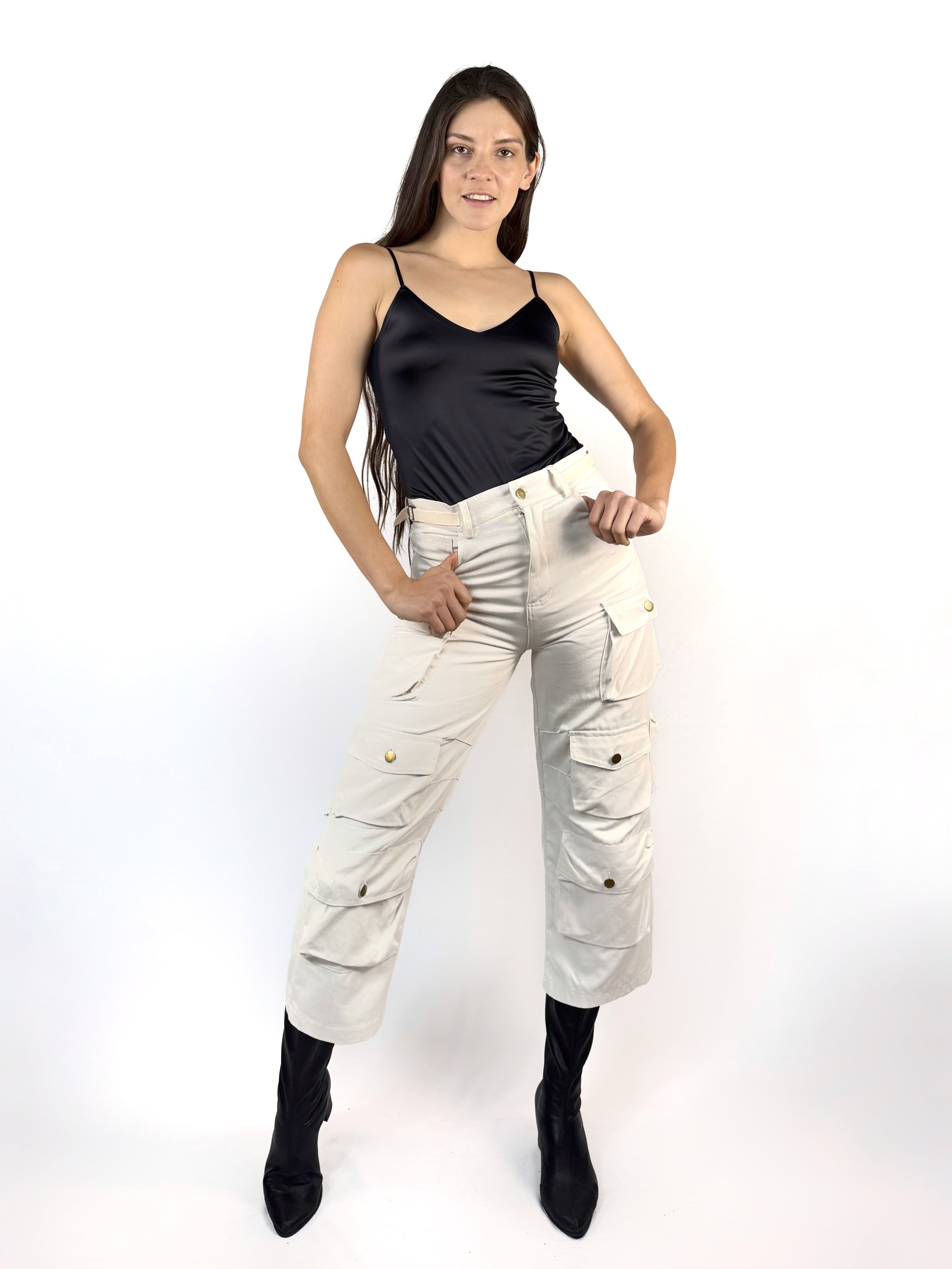 Fuerza Clara es la versión luminosa del pantalón cargo clásico. Con bolsillos funcionales, corte estructurado y un tono hueso que irradia calma y sofisticación, esta prenda equilibra poder y neutralidad con total naturalidad.