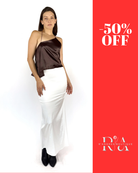 Elegante, fluida y con un brillo sutil que enamora. Luz de Luna es una falda larga de satén en tono blanco perla que se ajusta suavemente a la silueta.