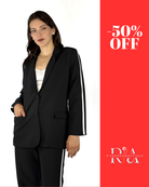El blazer estructurado con franjas laterales aporta una silueta nítida, mientras que el pantalón fluido equilibra el look con movimiento y presencia.