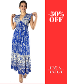 Es un vestido lleno de carácter. Su estampado étnico en blanco sobre azul vibrante lo hace destacar, mientras que el escote en V y las mangas con delicados olanes realzan la silueta con un toque bohemio. Un diseño versátil para quienes quieren sentirse libres, bellas y seguras.
