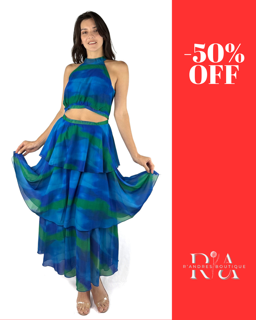 Es un vestido que fluye con cada paso. Su diseño de olanes en capas, escote halter y abertura cut-out en la cintura realzan la silueta con un aire juvenil y encantador. El estampado en tonos marinos con pinceladas verdes evoca el vaivén del océano. Perfecto para ocasiones especiales en climas cálidos.