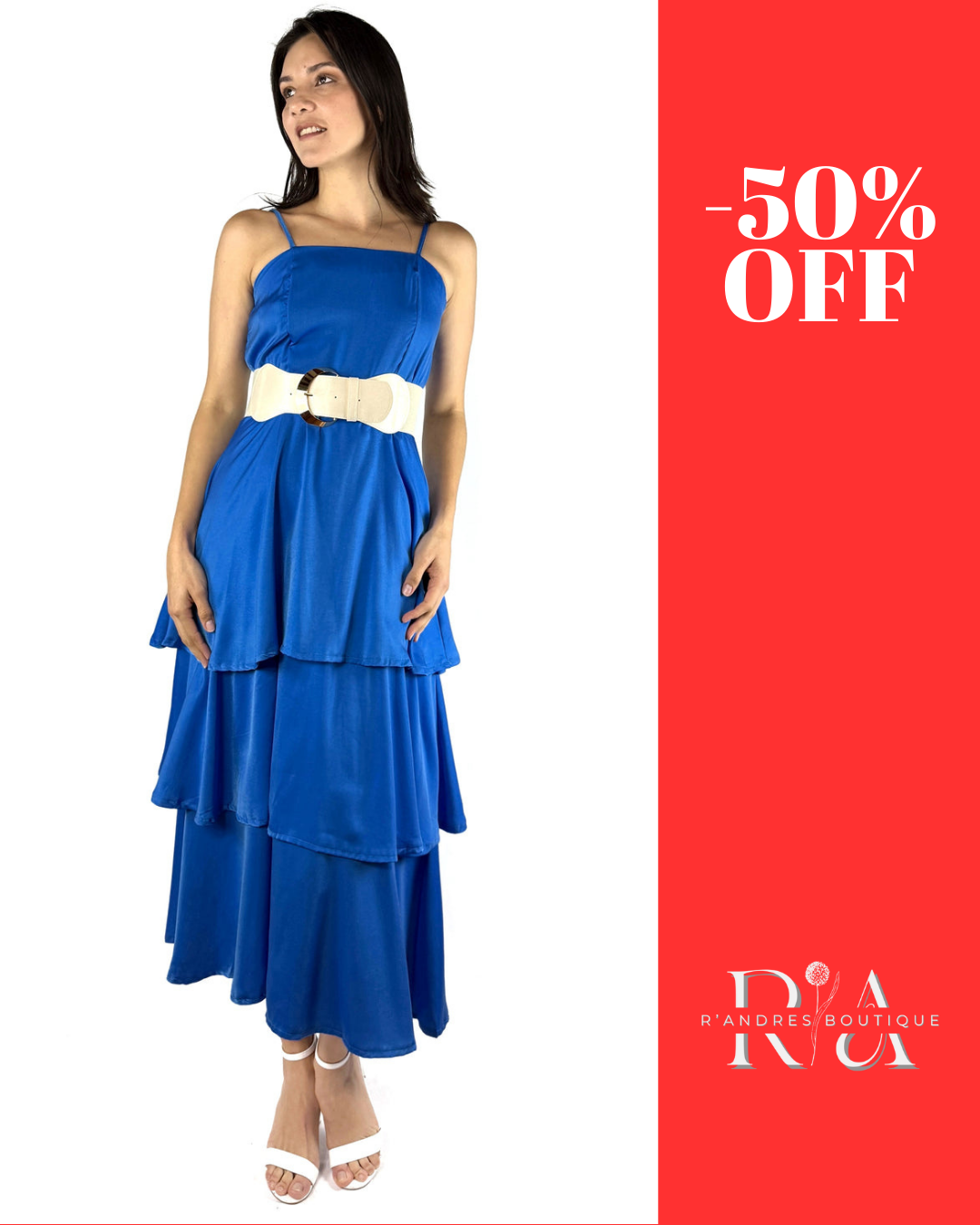 Este vestido azul destaca por su caída en capas y cinturón blanco que realza la cintura. Los tirantes delicados y el diseño fluido invitan al movimiento, mientras que su color transmite serenidad y optimismo. Ideal para brunches, reuniones especiales o días en que quieres vestir felicidad.