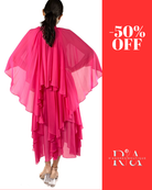 Etereidad pura en movimiento. Un vestido vaporoso con capas que flotan con cada paso. Su diseño envolvente y mangas tipo capa le otorgan una caída angelical que transforma cualquier momento en una pasarela. Un statement piece para las que aman el color con fuerza y dulzura.