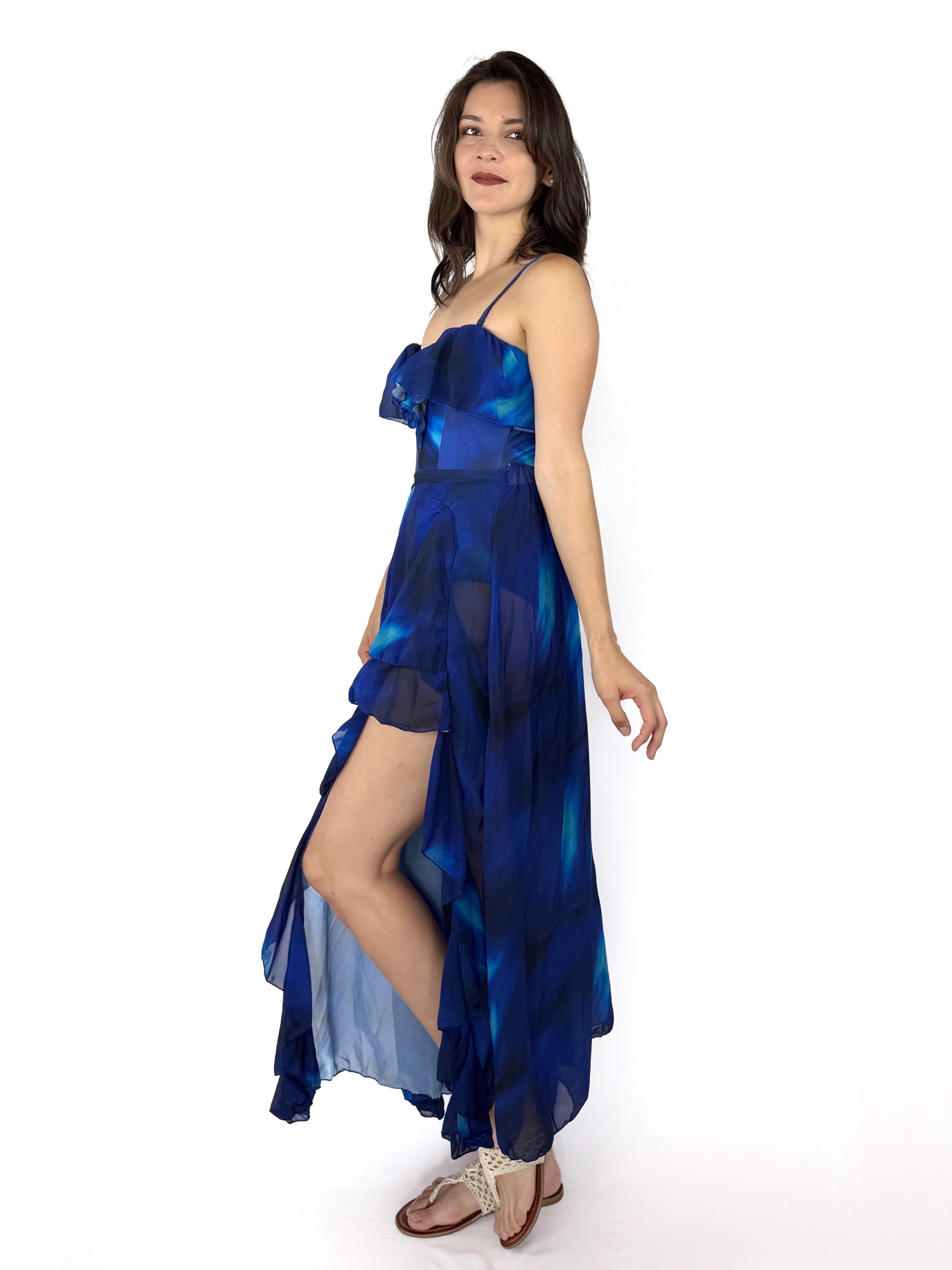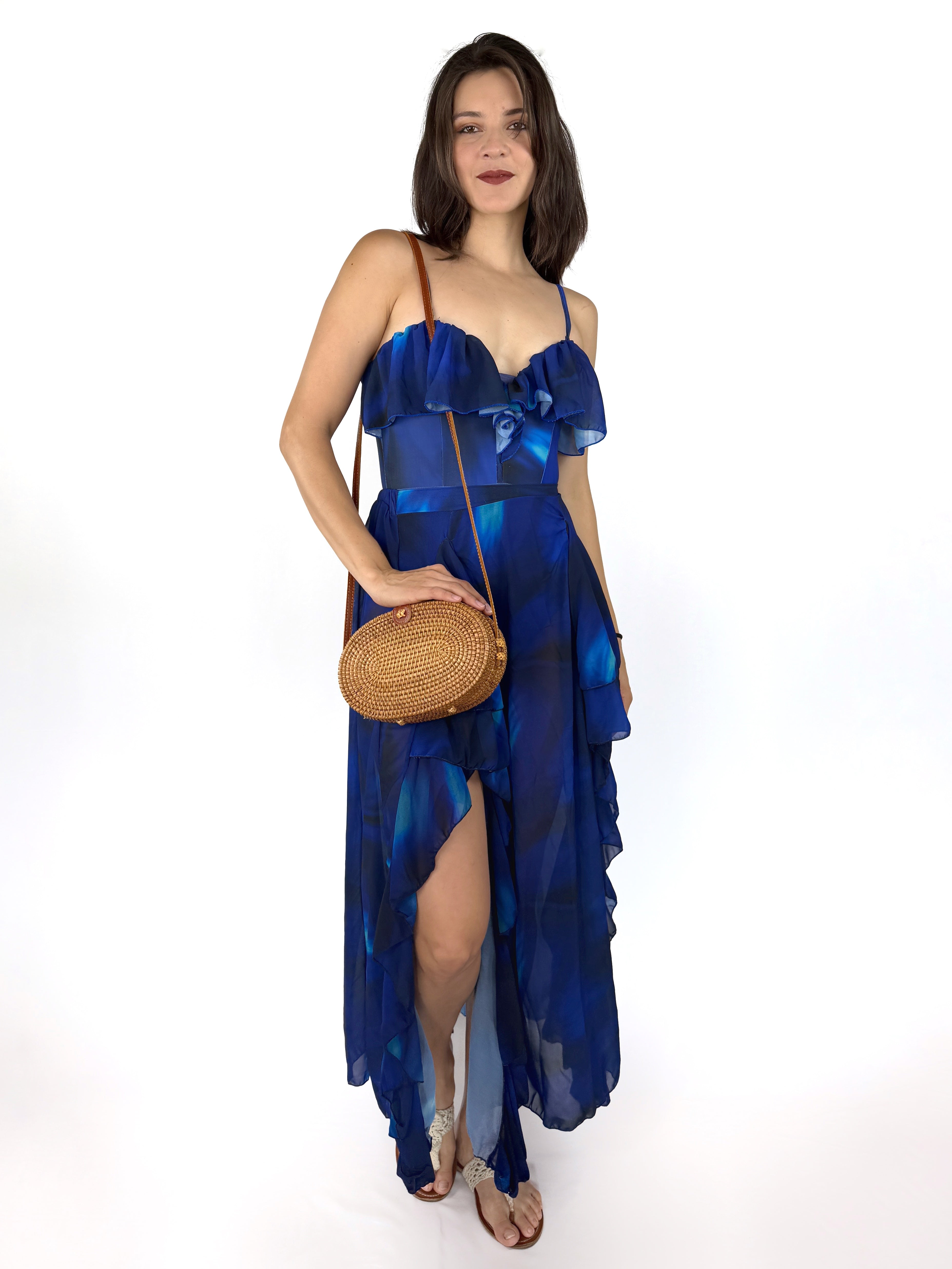 Mar Abierto es un traje de baño que se transforma contigo. Su diseño de una sola pieza con escote en volado realza el torso con delicadeza, mientras que el pareo vaporoso —en los mismos tonos de azul profundo— acompaña cada paso como una ola.