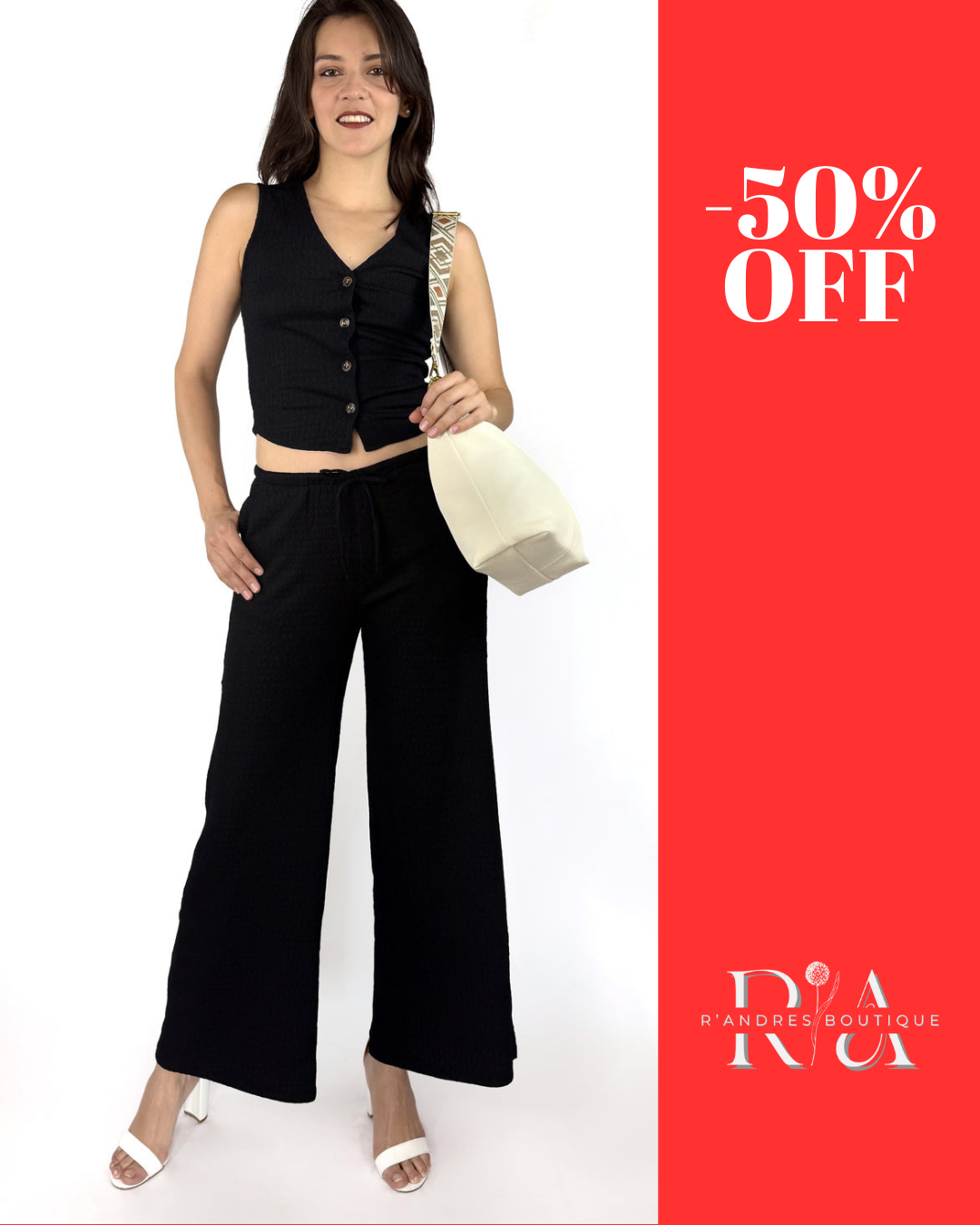 Negro Esencial es un set de dos piezas que combina la estructura sutil de un chaleco con la fluidez de un pantalón amplio y cómodo. Su diseño minimalista y monocromático permite crear looks que van del día a la noche con solo cambiar los accesorios.