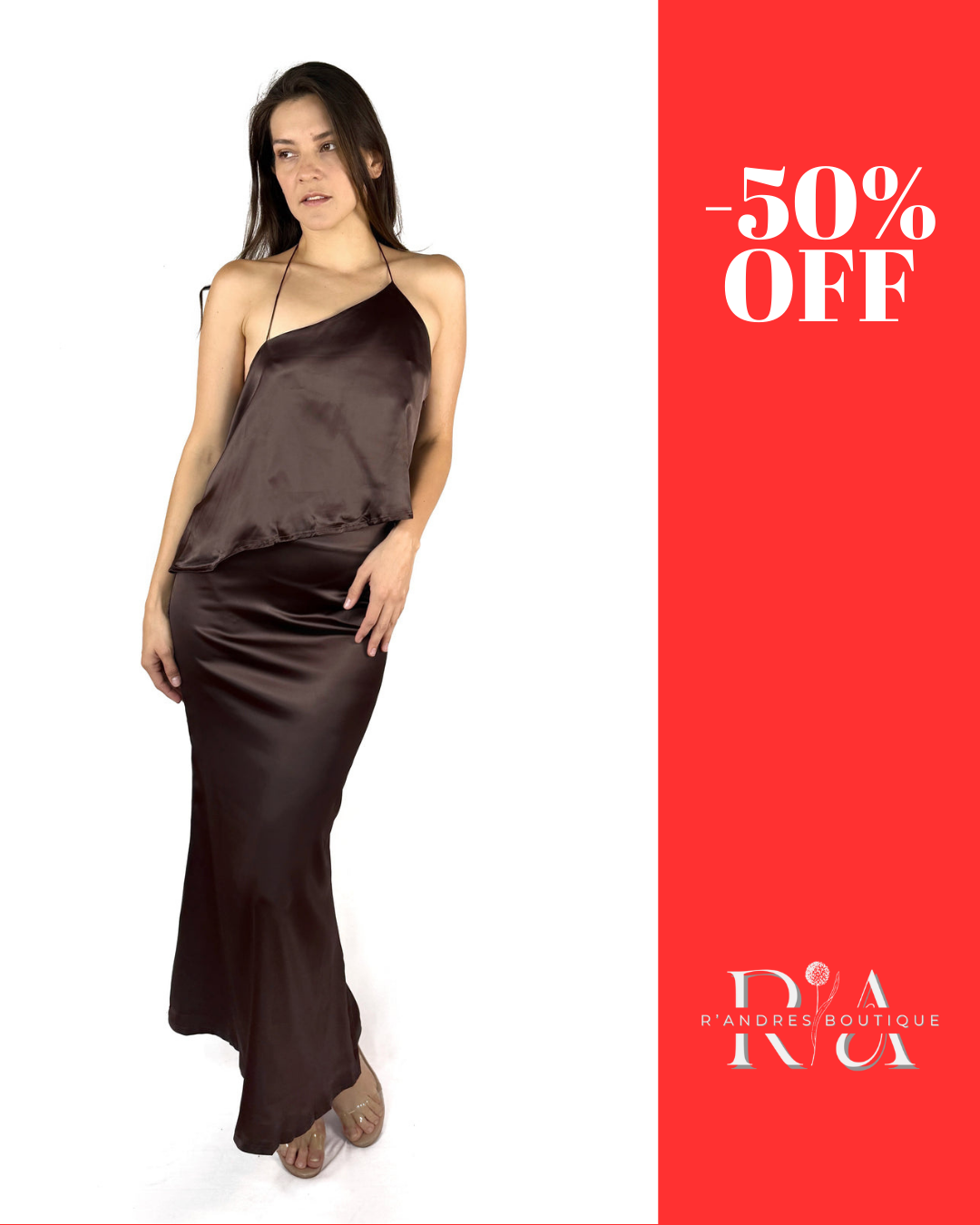 Minimalismo elegante con un toque de sensualidad. Noir Cacao es un set de blusa halter y falda larga en satén chocolate, pensado para quienes quieren destacar con sofisticación.