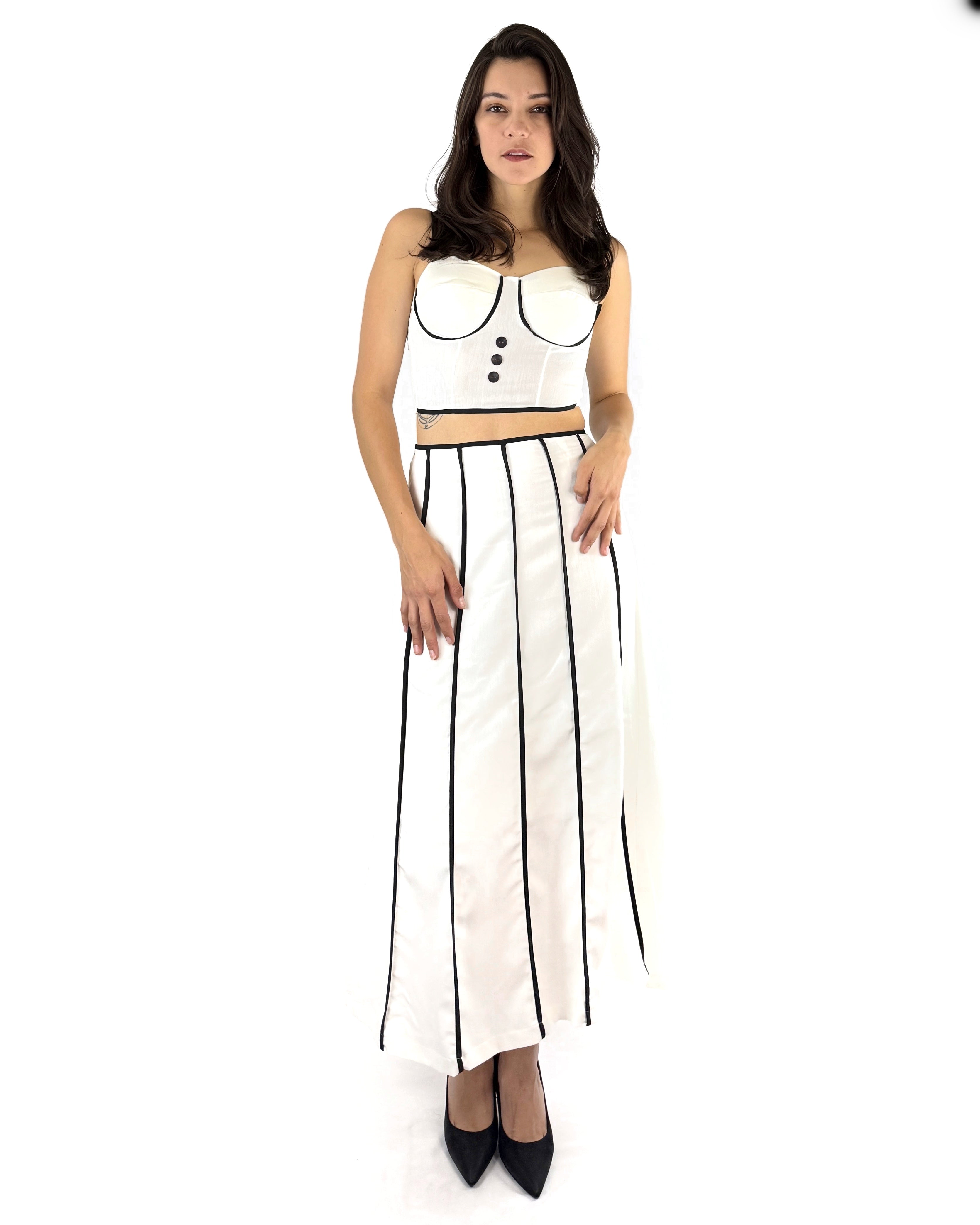 El top estructurado tipo bustier con vivos blancos aporta una silueta marcada y elegante, mientras que la falda larga de líneas verticales estiliza la figura con un guiño moderno y audaz.