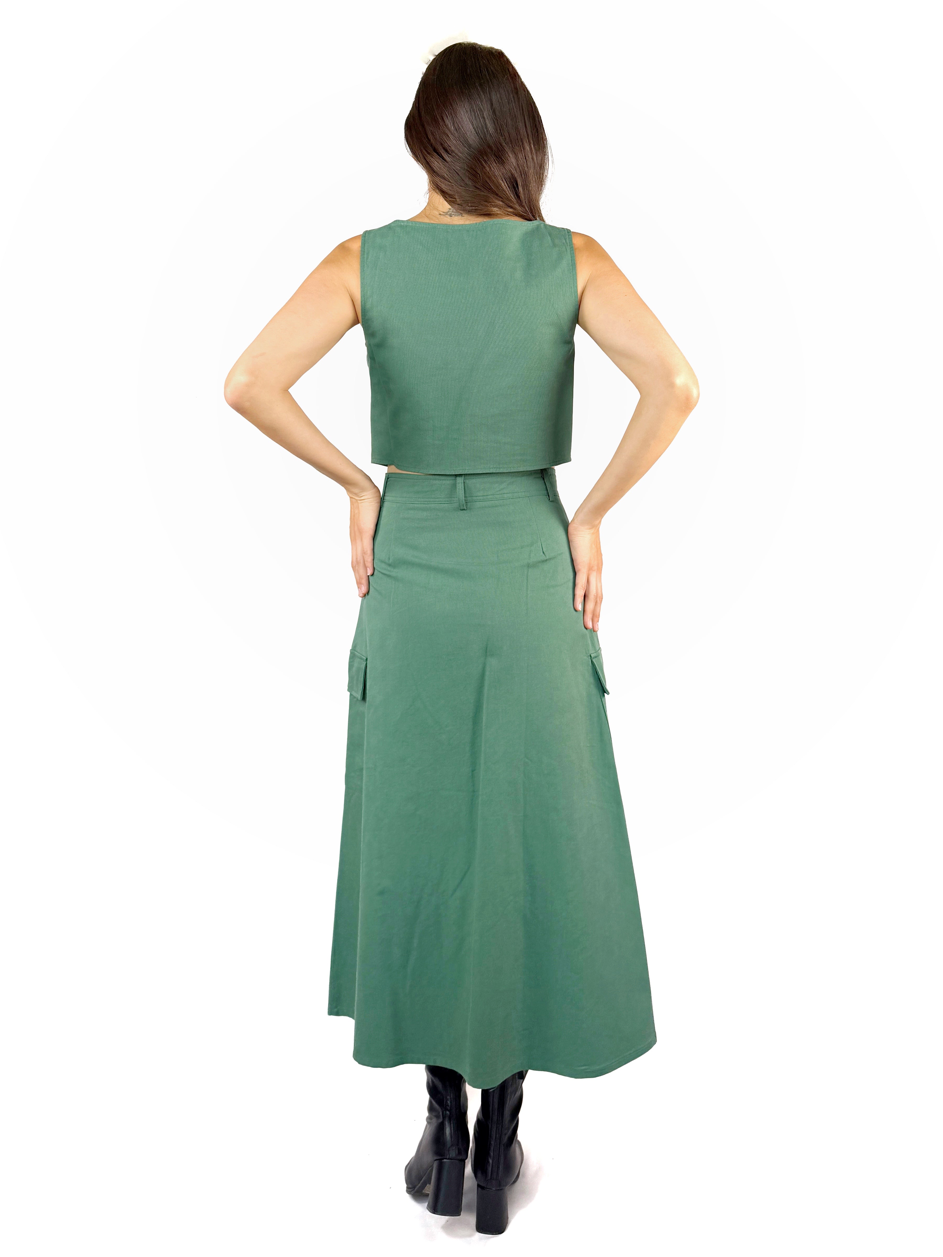 Fuerte, funcional y con estilo sin esfuerzo. Selva Urbana es un conjunto de top y falda que fusiona el diseño utilitario con una silueta moderna y femenina.