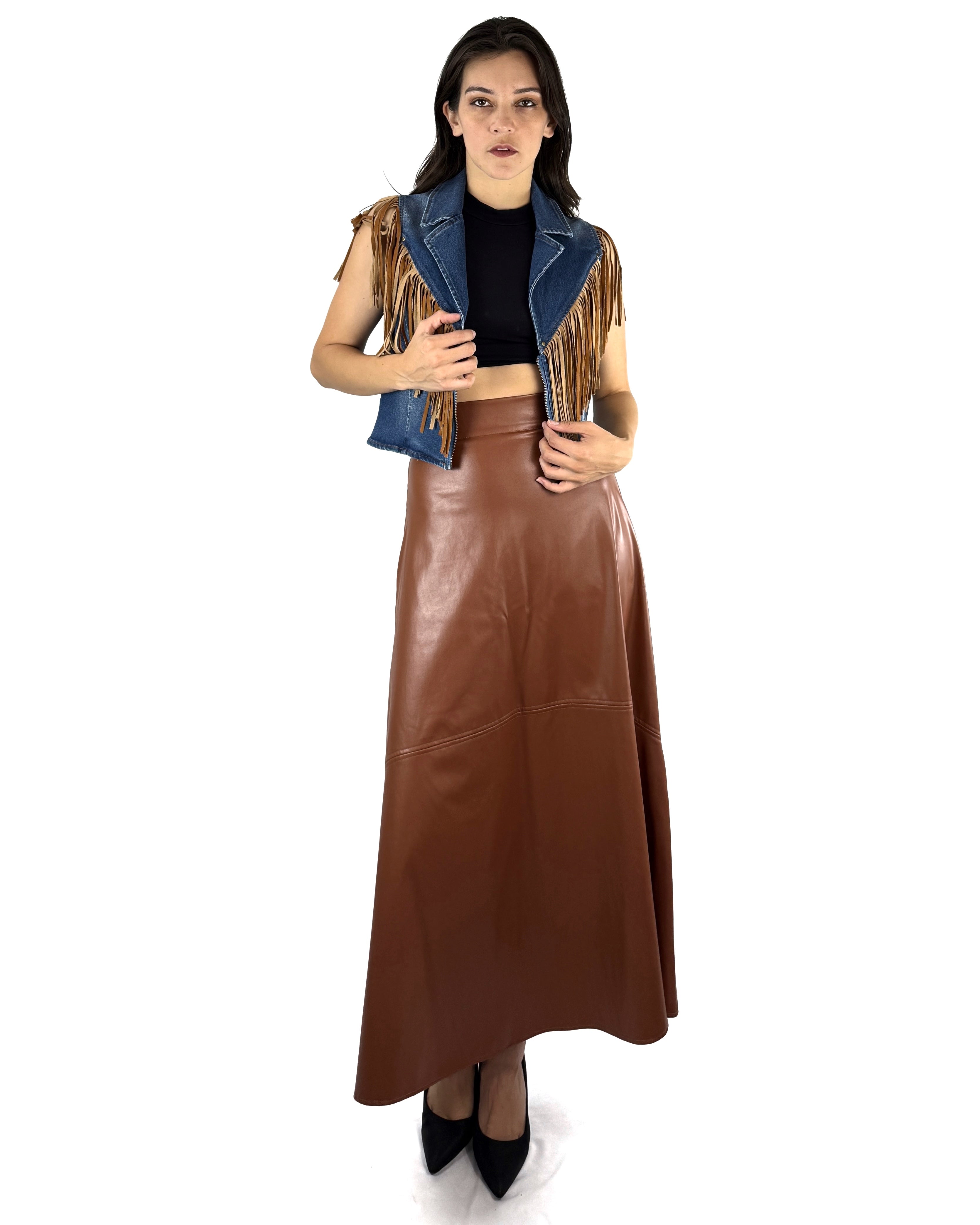 Terra Swing es una falda midi de vinipiel en tono café terracota, con un diseño fluido y elegante que combina estructura y movimiento. Su corte amplio en línea A aporta dramatismo sin perder sofisticación, mientras que la textura efecto piel le da un toque moderno y audaz.