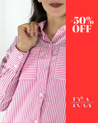 Rose Code reinterpreta la clásica camisa de rayas con una silueta relajada y un juego visual entre líneas verticales y horizontales que estilizan y elevan. El tono rosa intenso le da un aire sofisticado, moderno y a la vez dulce. Perfecta para llevar con actitud desde un look de oficina relajado hasta una salida casual con jeans y tacones.