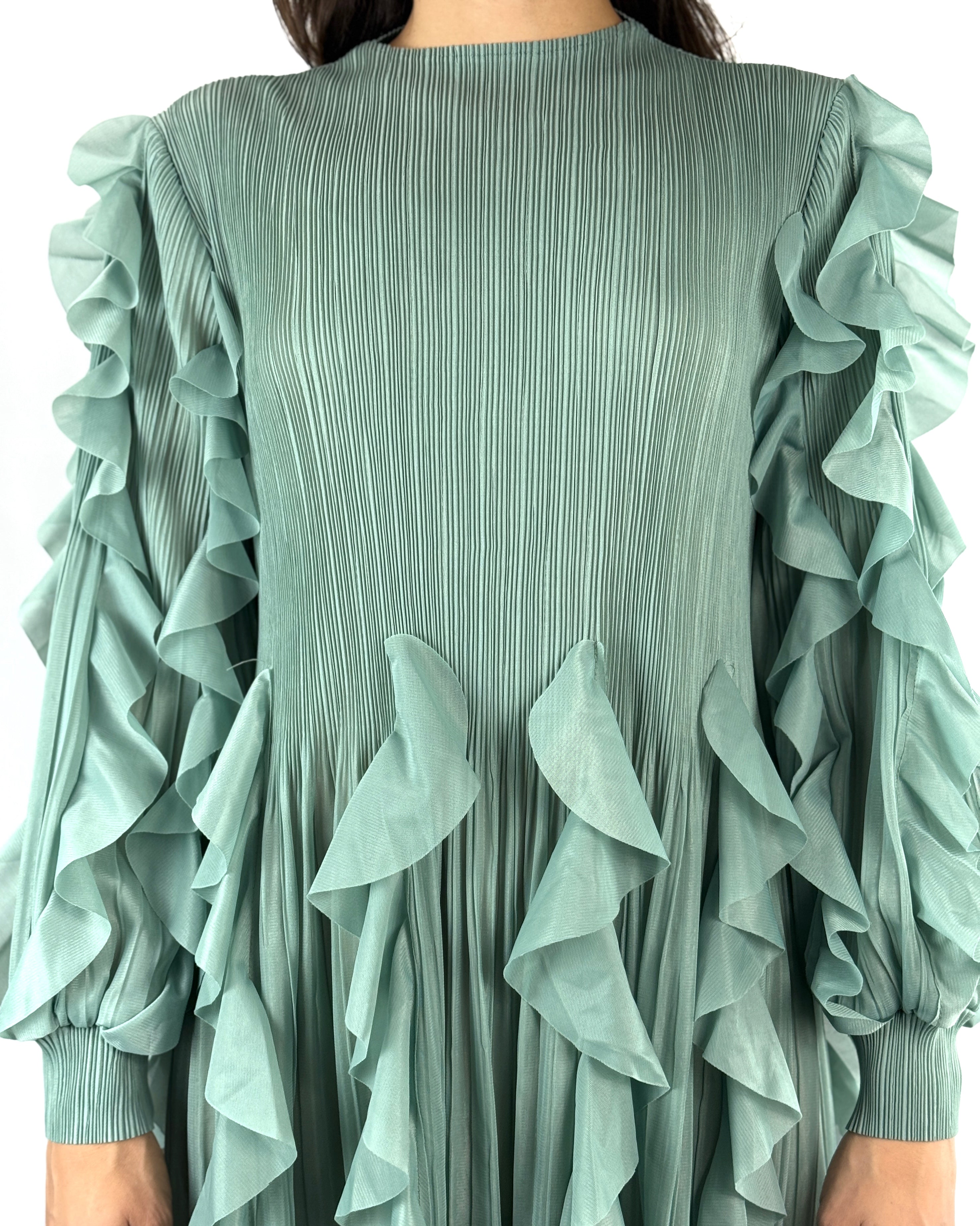 Confeccionado en una tela ligera de acabado satinado, su diseño destaca por los olanes plisados estratégicamente ubicados que enmarcan la silueta y aportan dinamismo a cada paso. Las mangas abullonadas y la caída fluida crean un balance entre elegancia y modernidad, convirtiéndolo en la pieza perfecta para ocasiones donde quieres destacar con un look refinado, chic y lleno de personalidad.