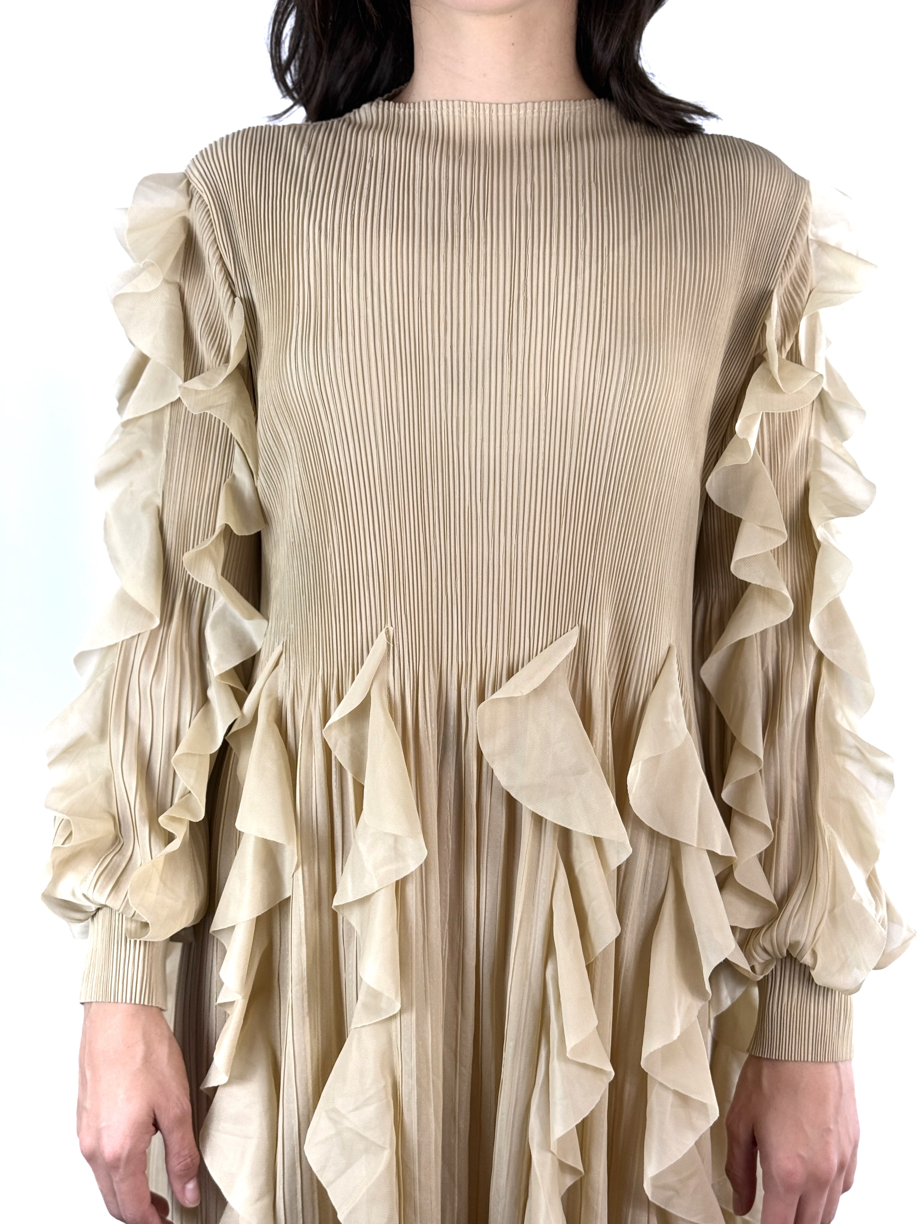 Satin Rive – Vestido beige largo con olanes plisados (UNITALLA)