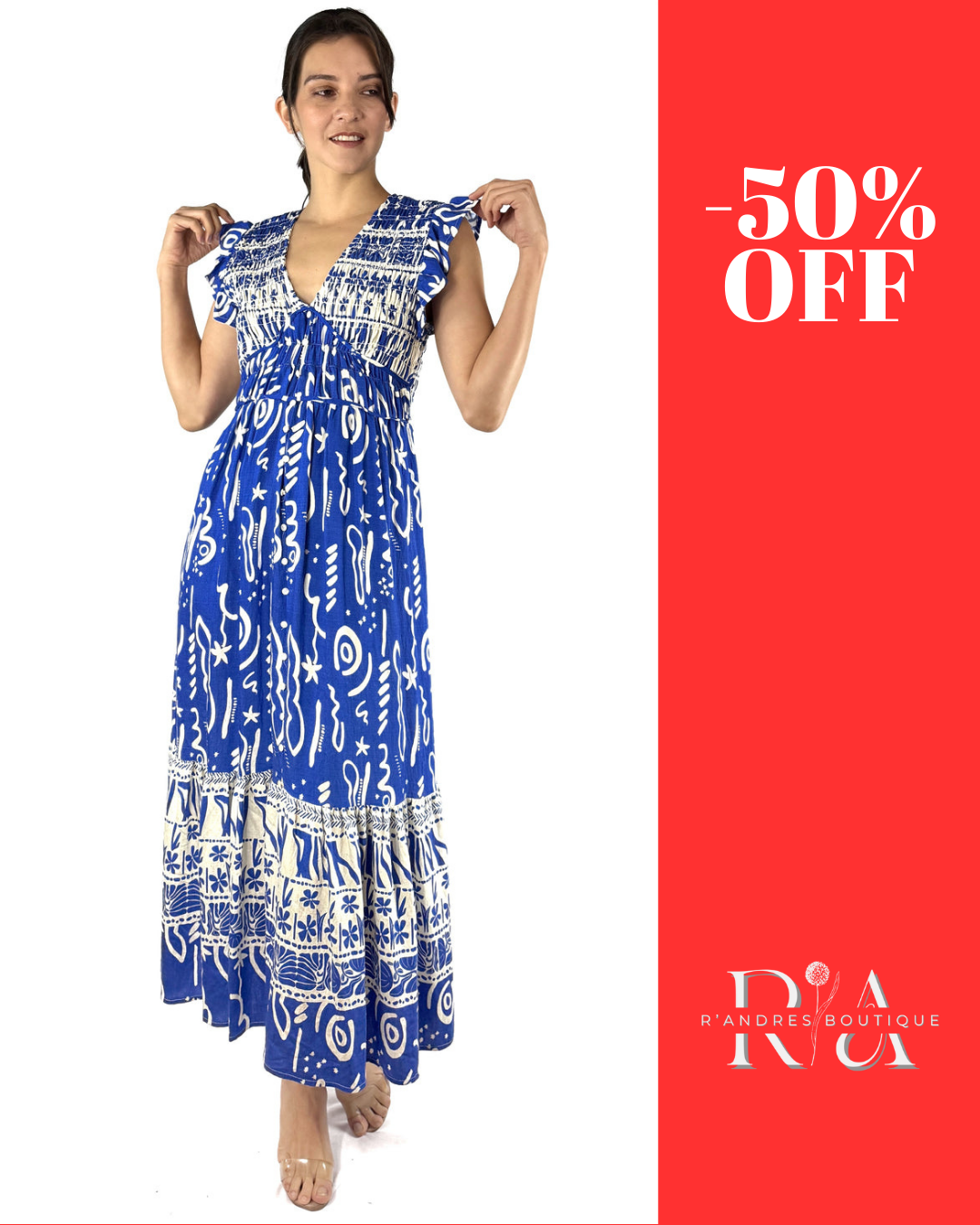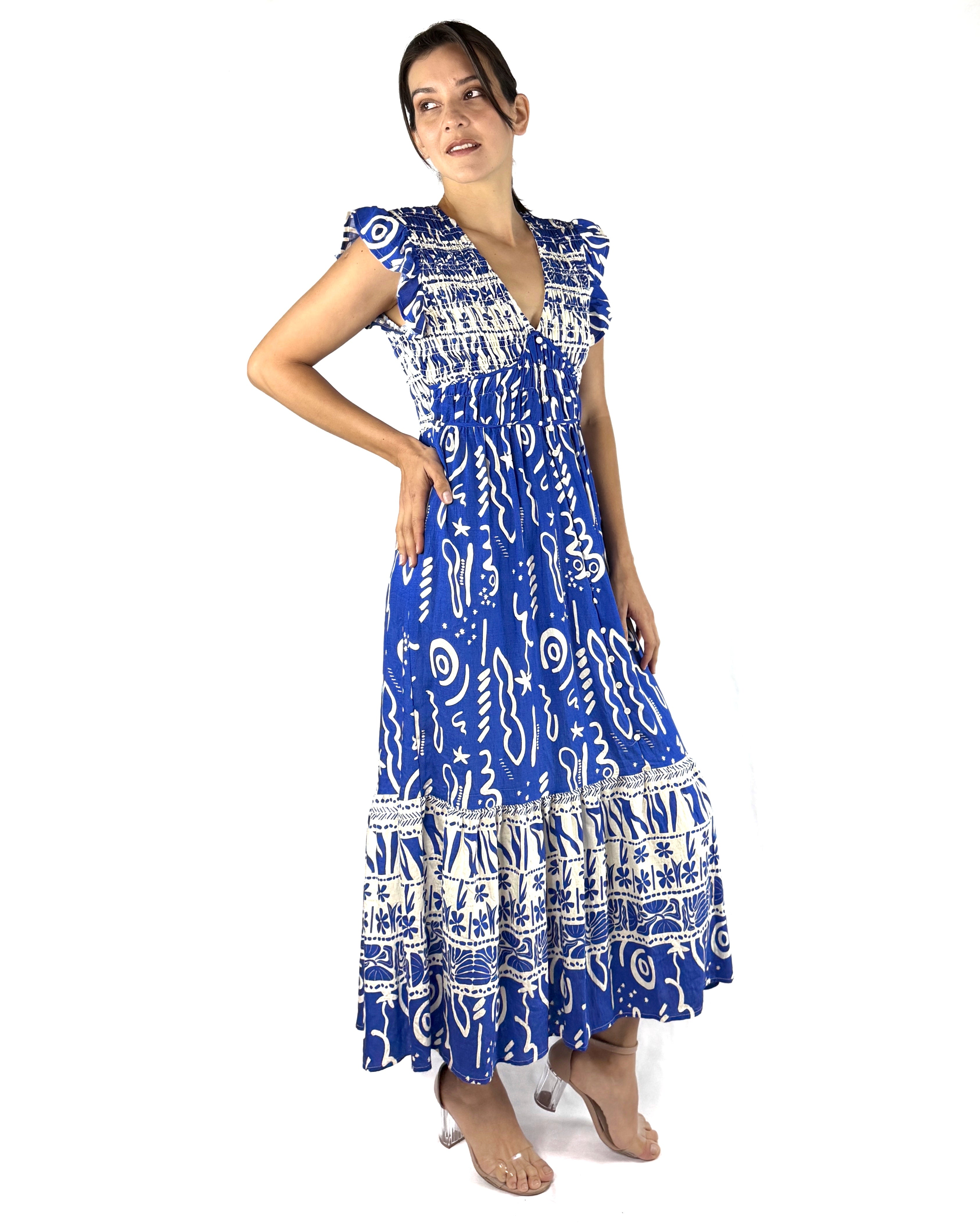 Es un vestido lleno de carácter. Su estampado étnico en blanco sobre azul vibrante lo hace destacar, mientras que el escote en V y las mangas con delicados olanes realzan la silueta con un toque bohemio. Un diseño versátil para quienes quieren sentirse libres, bellas y seguras.