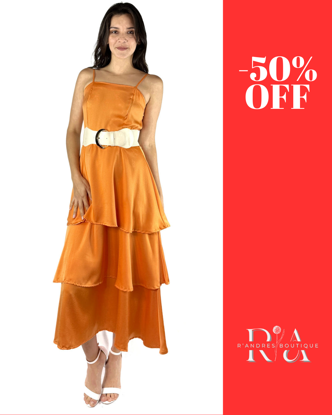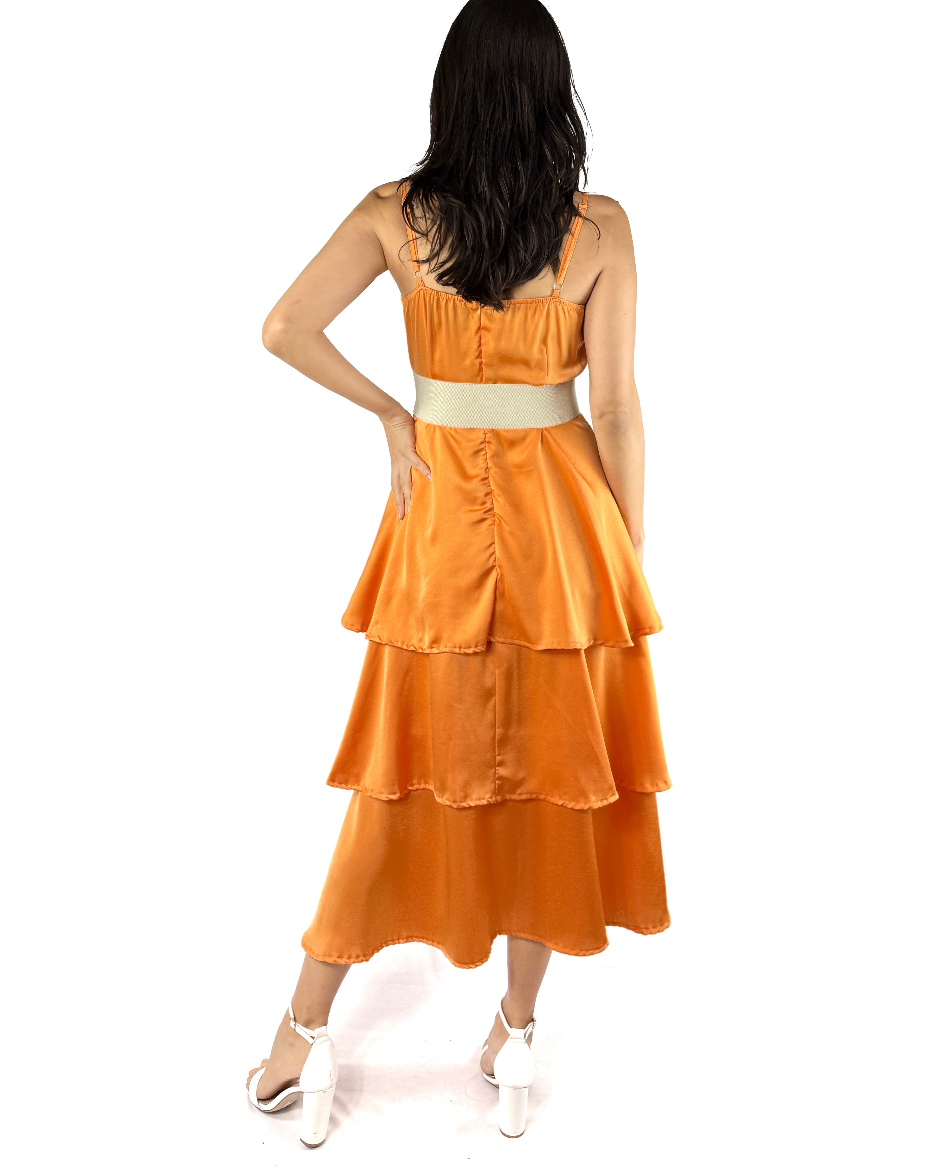 Este vestido naranja destaca por su caída en capas y cinturón blanco que realza la cintura. Los tirantes delicados y el diseño fluido invitan al movimiento, mientras que su color transmite serenidad y optimismo. Ideal para brunches, reuniones especiales o días en que quieres vestir felicidad.