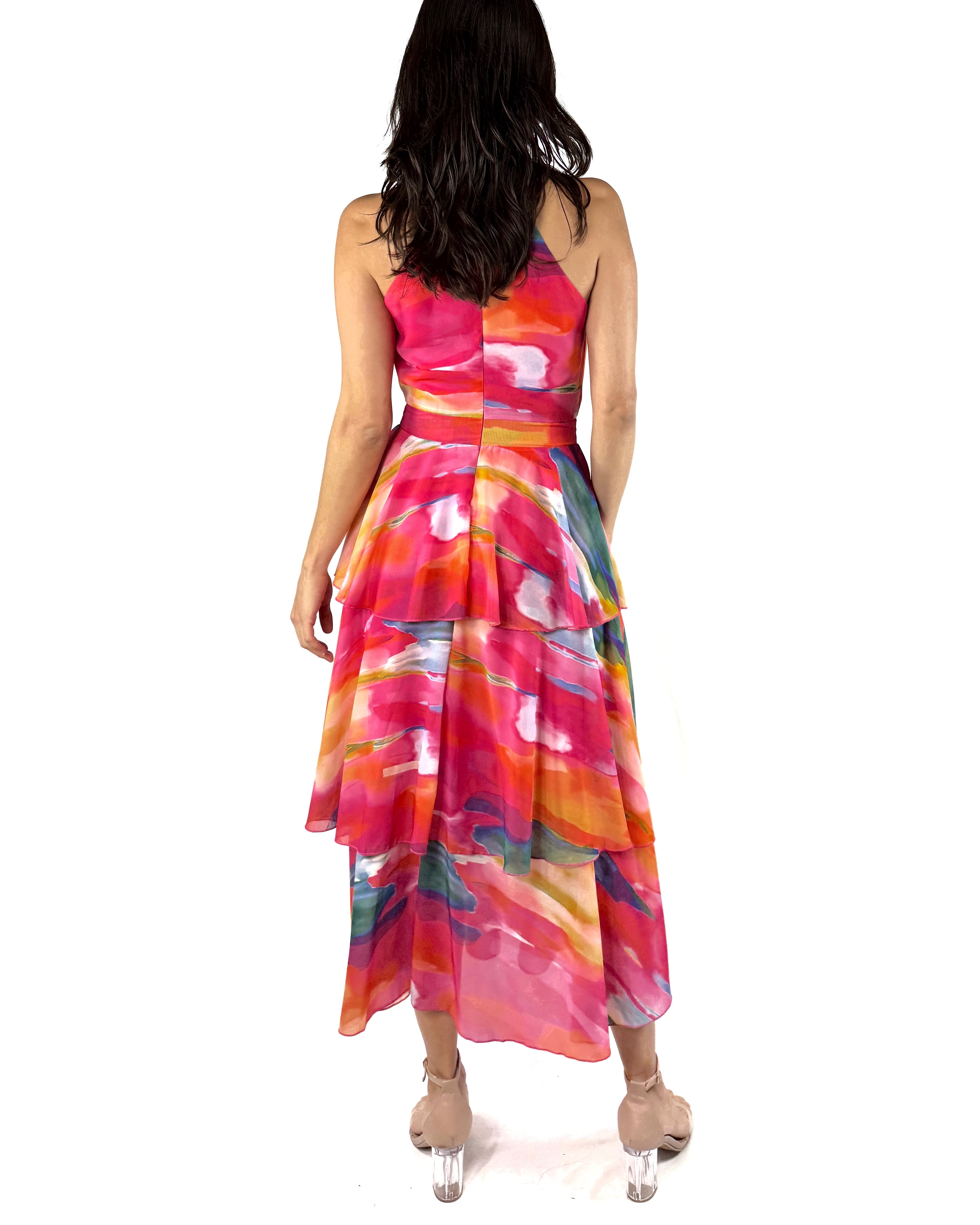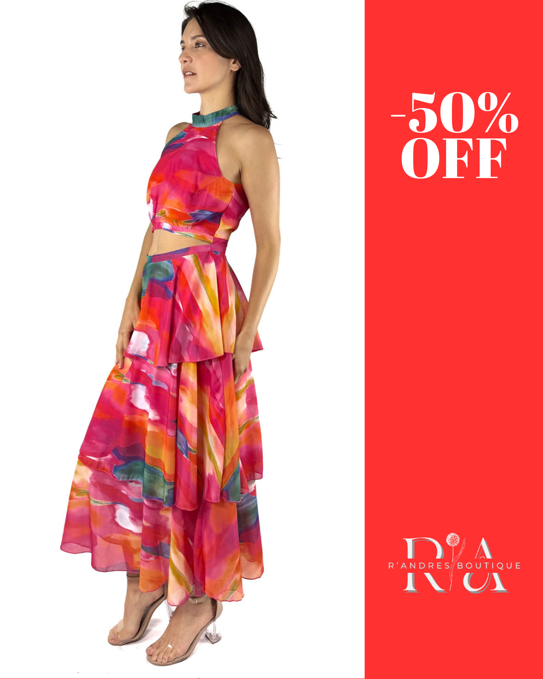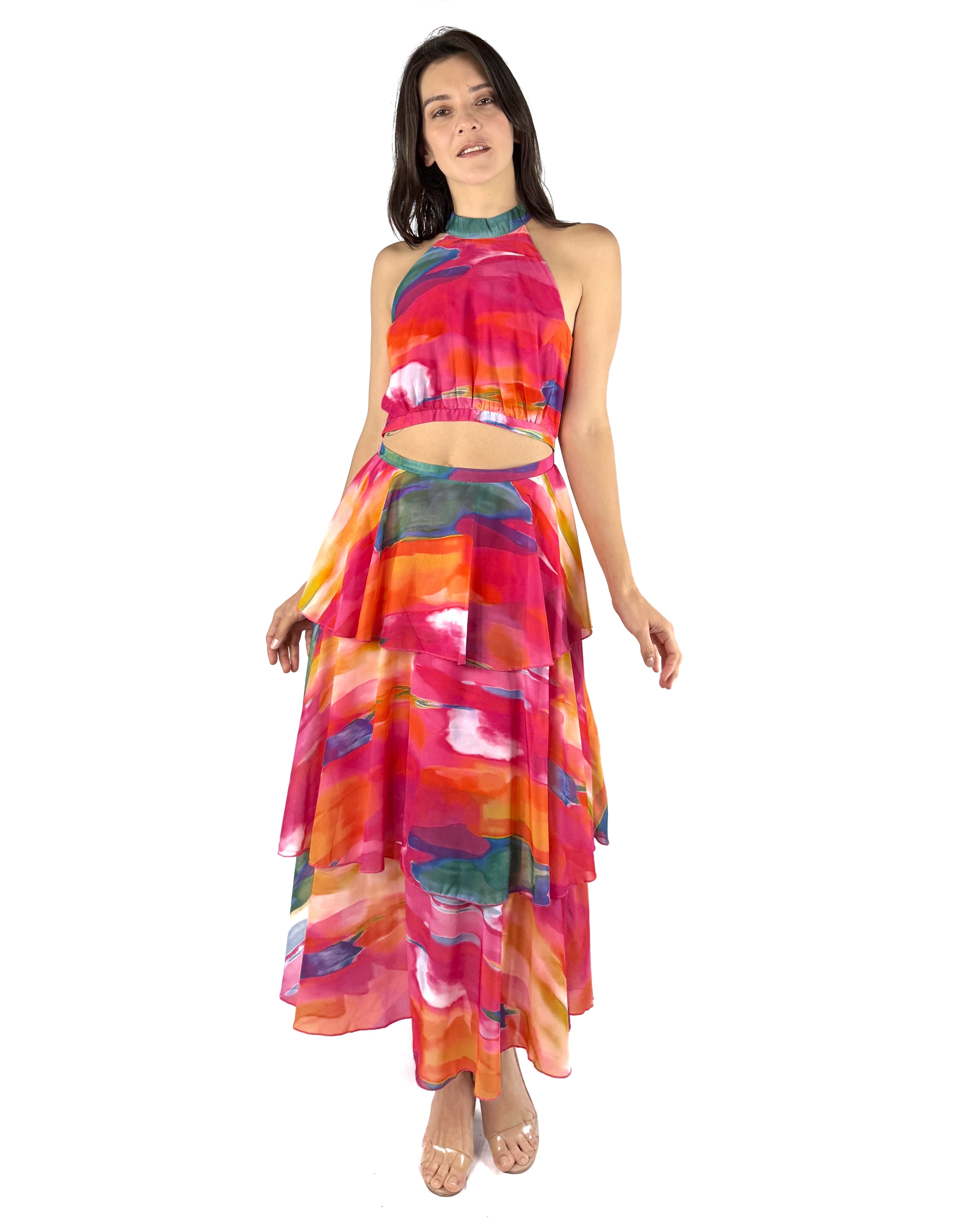 Es un vestido que fluye con cada paso. Su diseño de olanes en capas, escote halter y abertura cut-out en la cintura realzan la silueta con un aire juvenil y encantador. Perfecto para ocasiones especiales en climas cálidos.