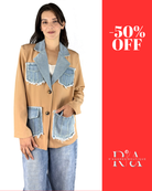 Este blazer juega con los extremos: lo clásico y lo crudo. Este blazer camel destaca por sus llamativas aplicaciones de mezclilla con acabado deshilachado, en solapas y bolsillos. Un statement urbano con alma rebelde y estilo propio.