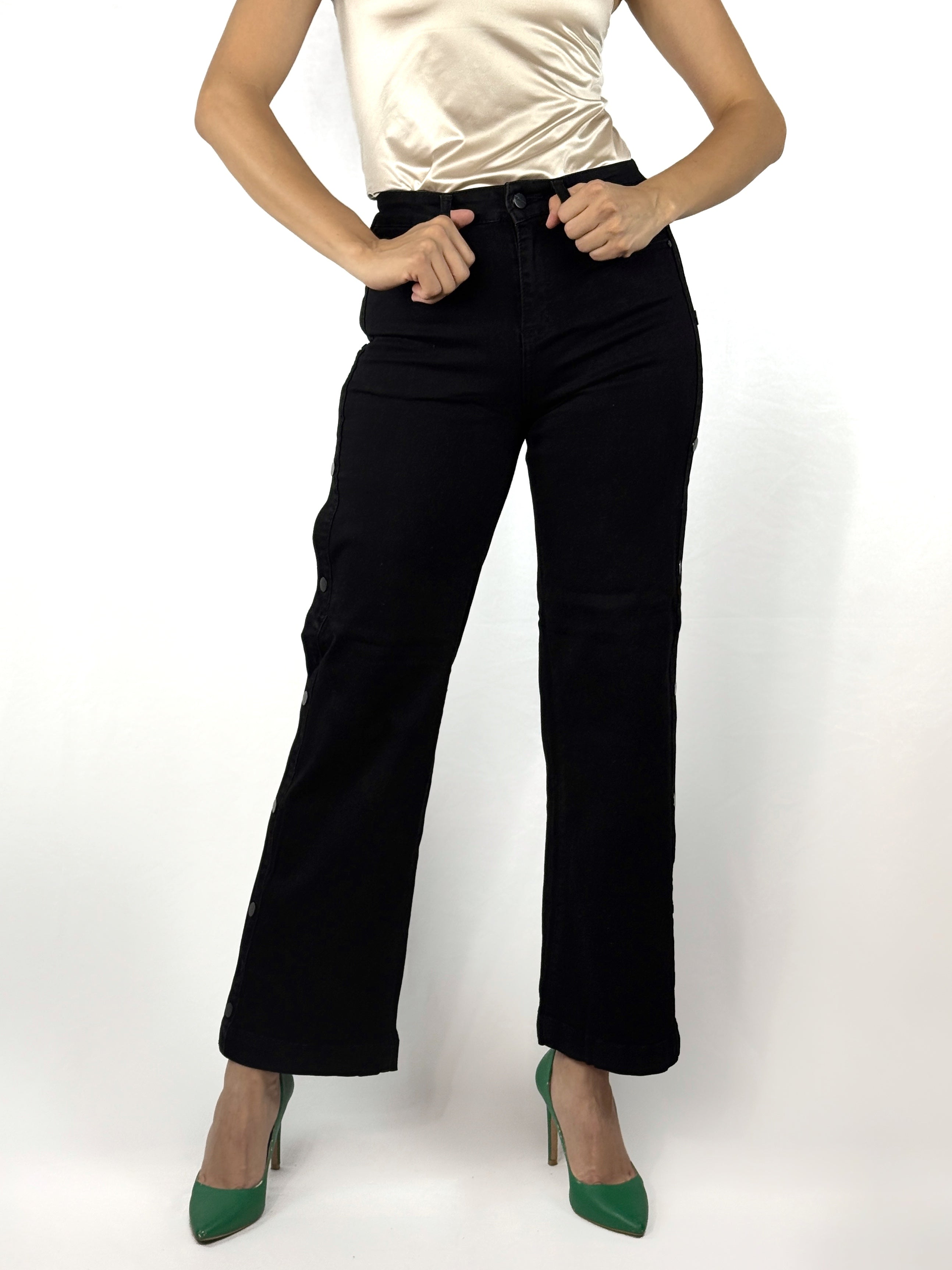 Black Snap - Pantalón de mezclilla negro con botones en los laterales