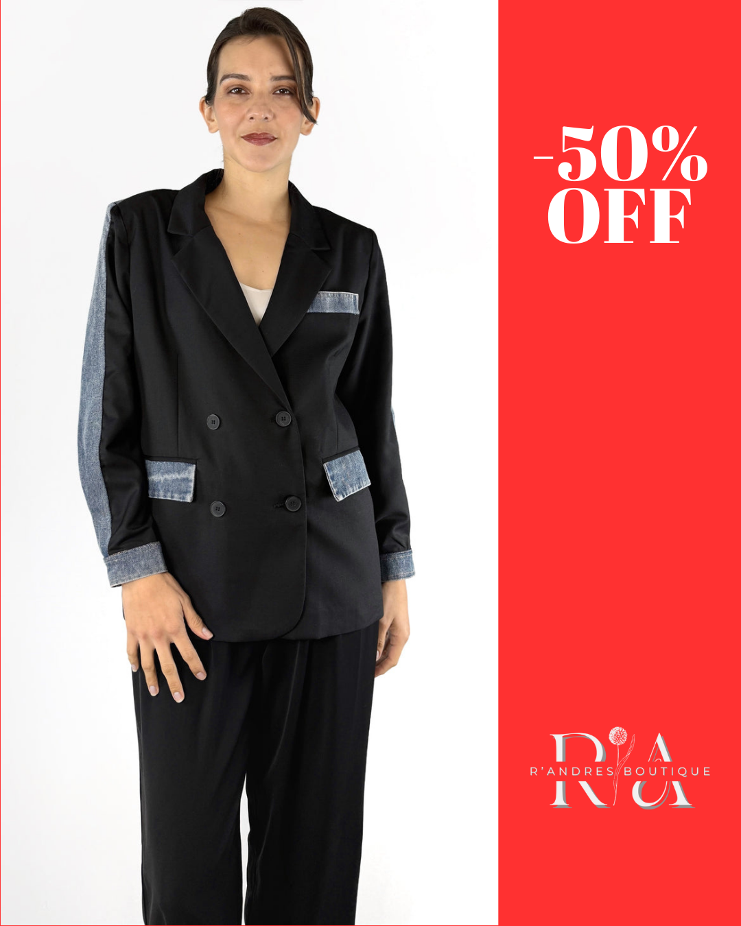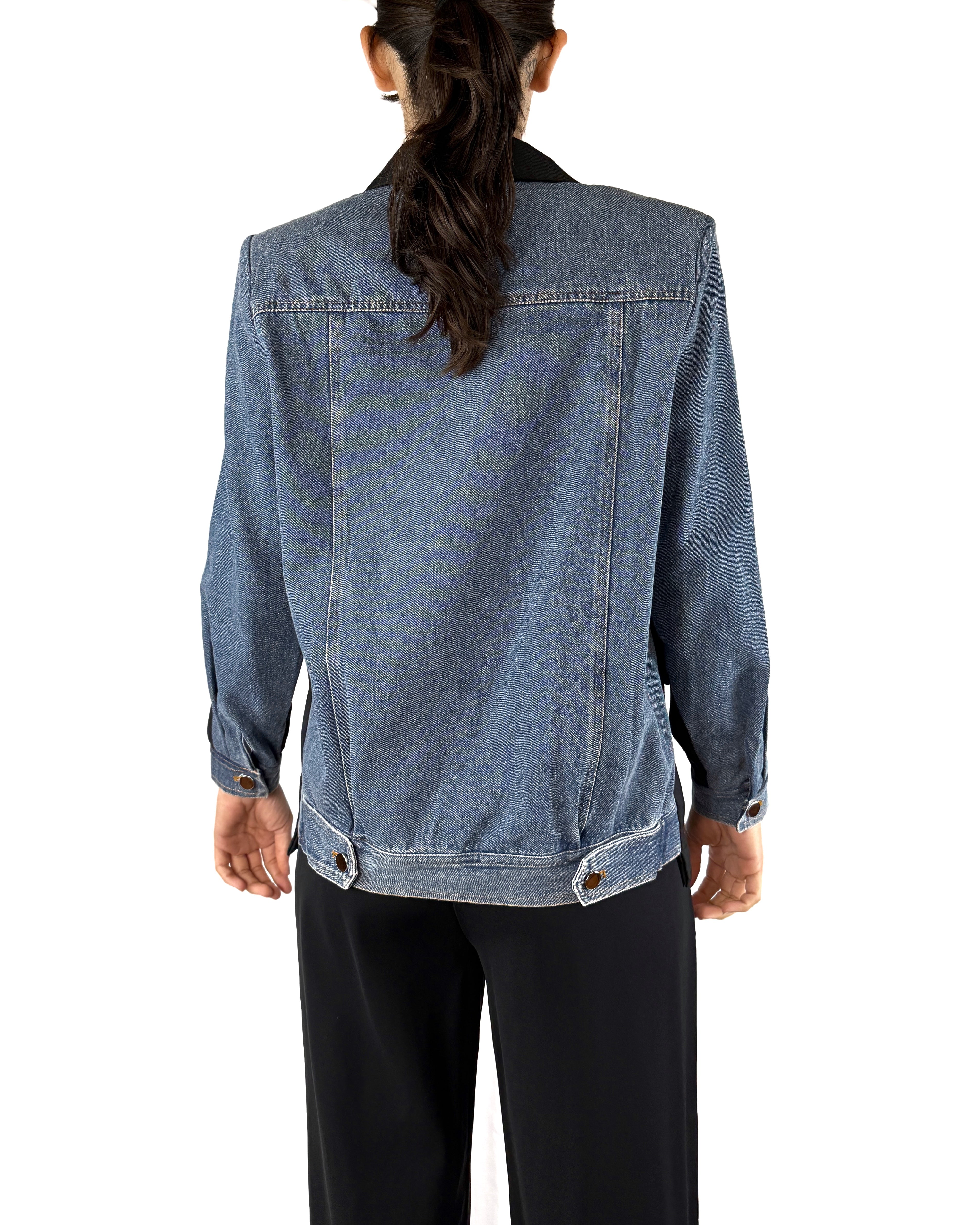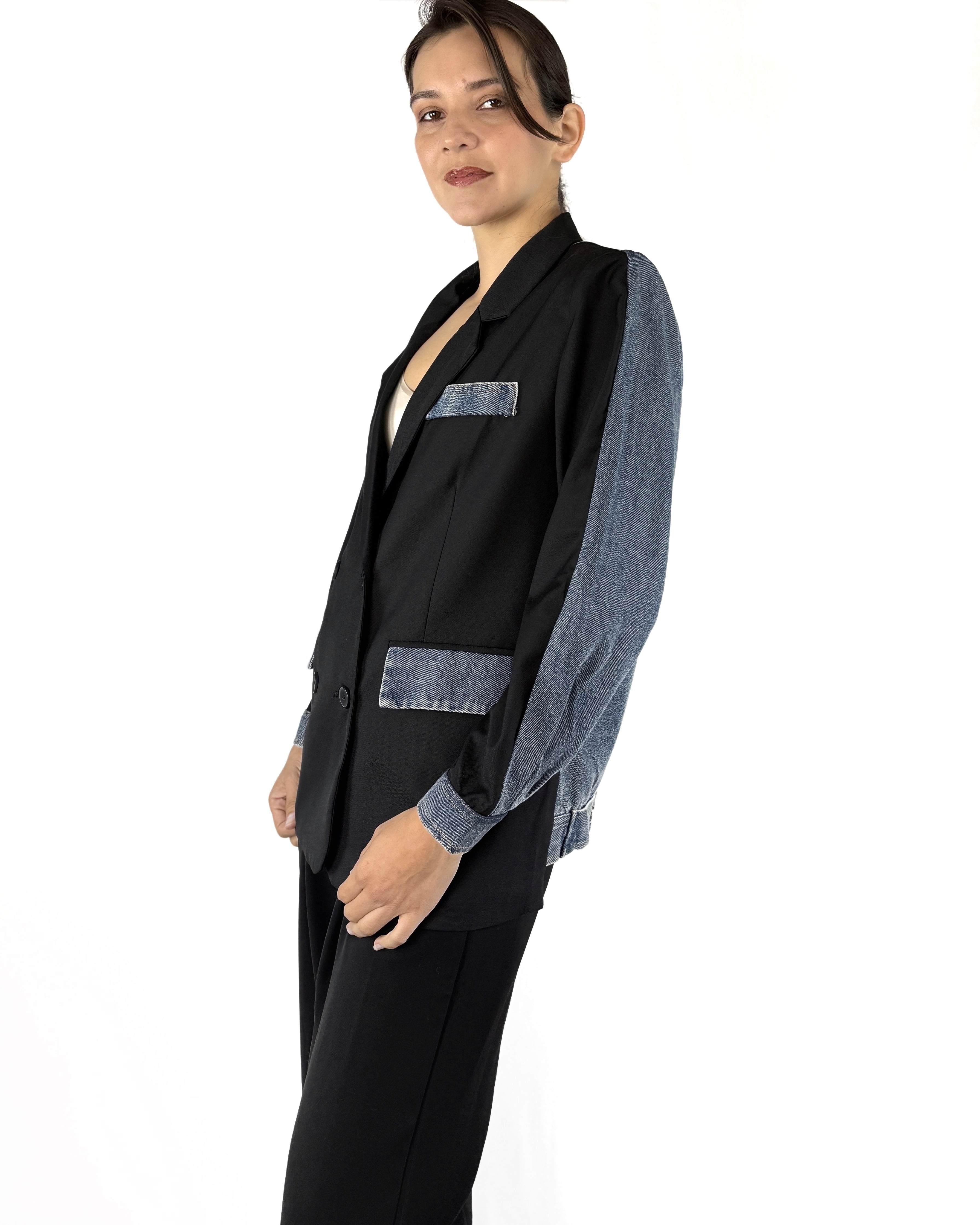 Un blazer que juega con la construcción: el frente clásico contrasta con mangas y espalda en mezclilla auténtica, revelando una personalidad entre lo formal y lo rebelde. Ideal para quienes buscan marcar diferencia sin perder sofisticación.