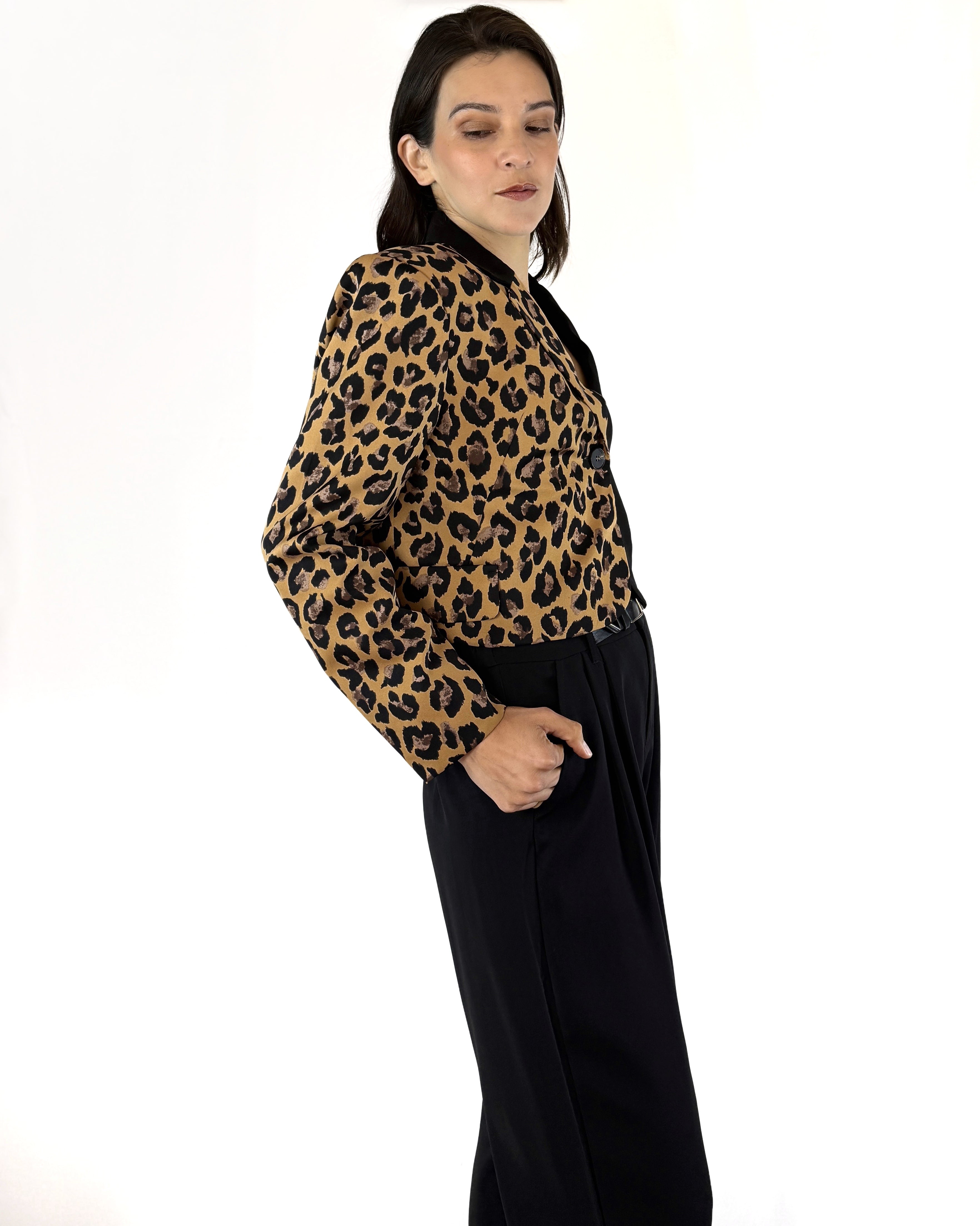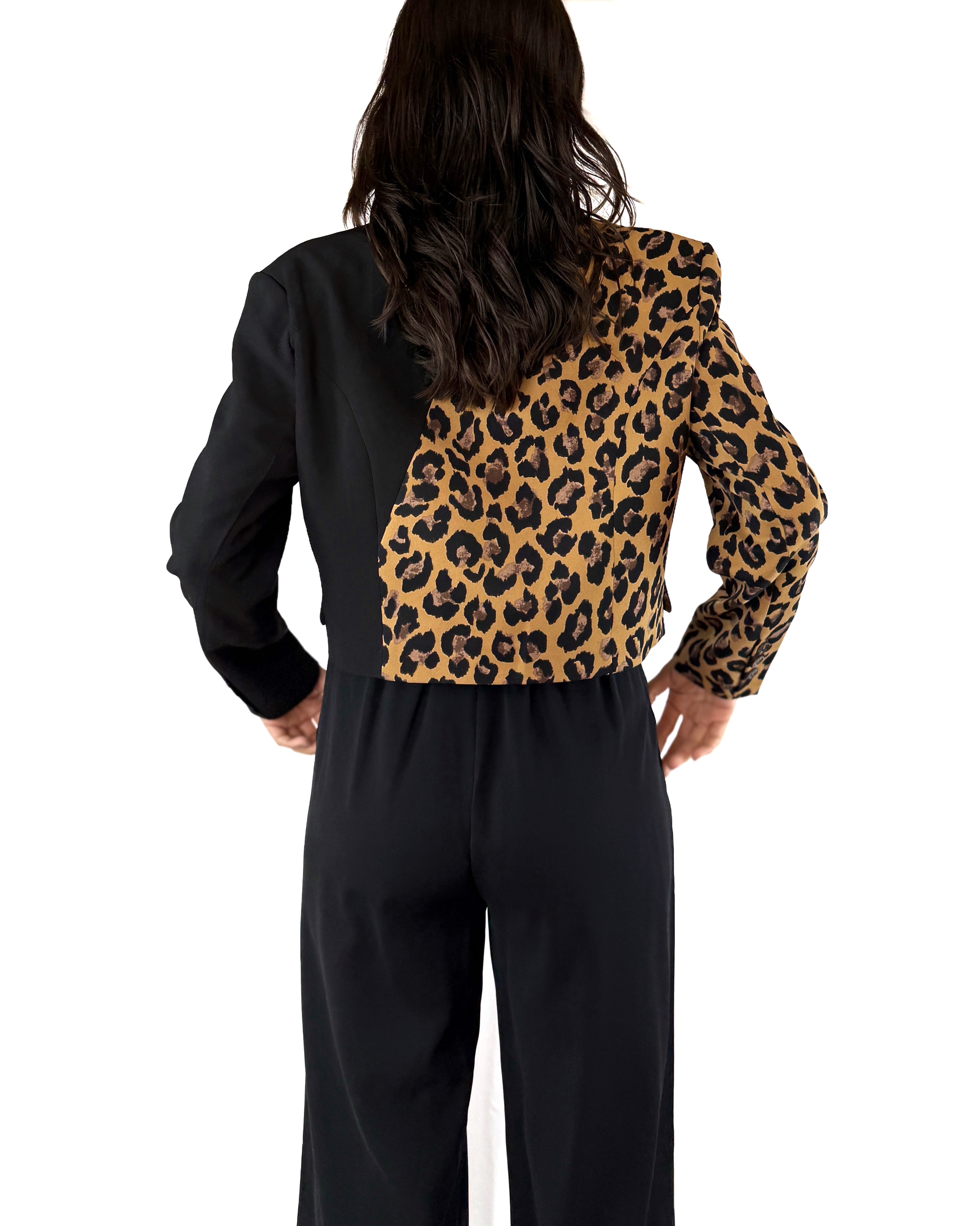 Este blazer corto desafía las reglas con un diseño dividido entre el desenfreno del animal print y la elegancia del tono crudo. Una pieza poderosa para mujeres que combinan fuerza y sofisticación en un mismo outfit. Ideal para llevar con actitud, de día o de noche.