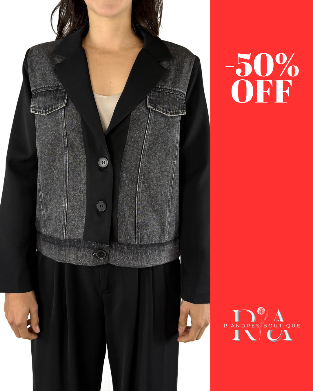 El saco mezcla la elegancia del blazer con la rebeldía del denim en un diseño que destaca por sus detalles sutiles y una silueta contemporánea.